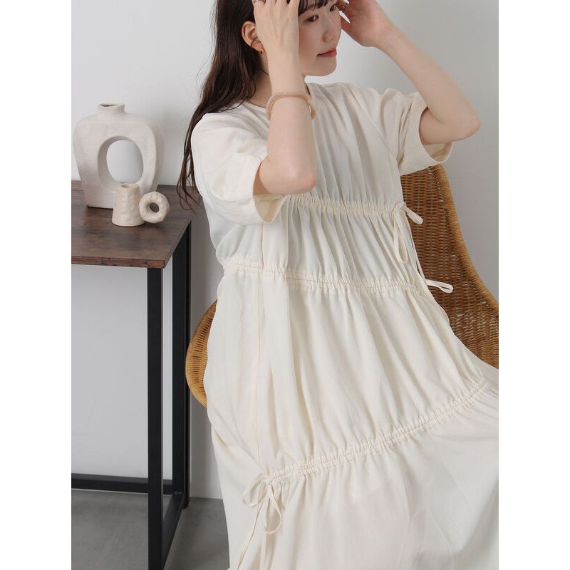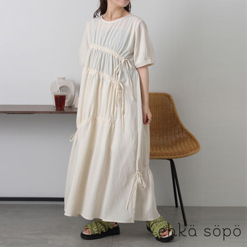 ehka sopo 隨興感不對稱抽繩綁帶短袖連身洋裝(0F000902210)本白F|黑色F|綠色Fearth music&ecology Select Store