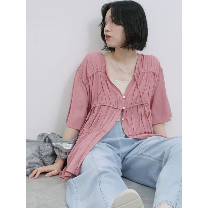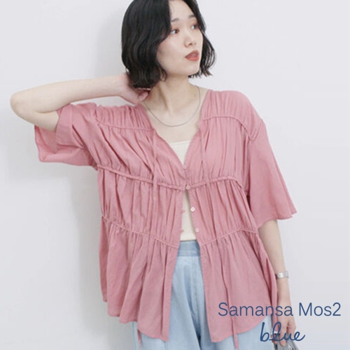 Samansa Mos2 blue 層次感抓褶綁帶V領短袖襯衫(0F000751210)象牙色F|黑色F|粉紅色FShirts & Blousesearth music&ecology Select Store