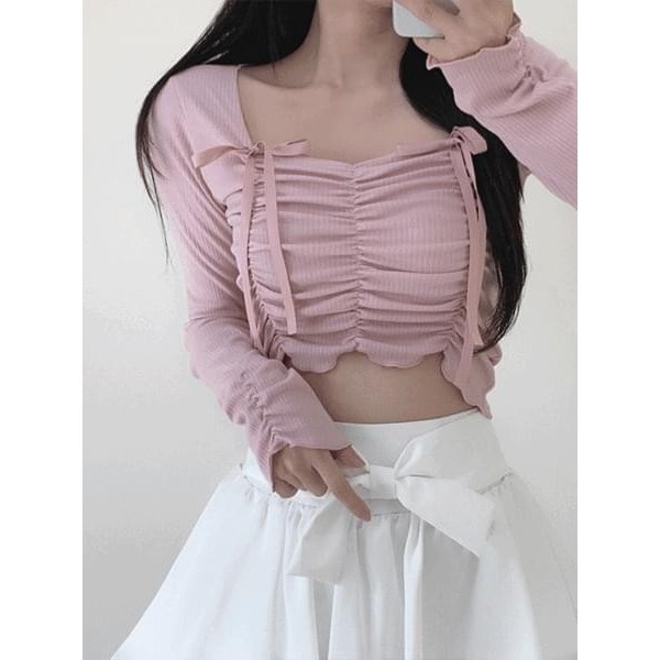 Codibook|韓國 J-BLIN 蝶結綁帶抓皺領方領長袖針織上衣[預購]長袖上衣 女裝象牙白|粉紅色|黑色T-shirtsCodibook 韓國女裝購物平台