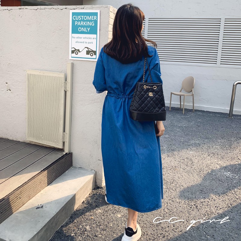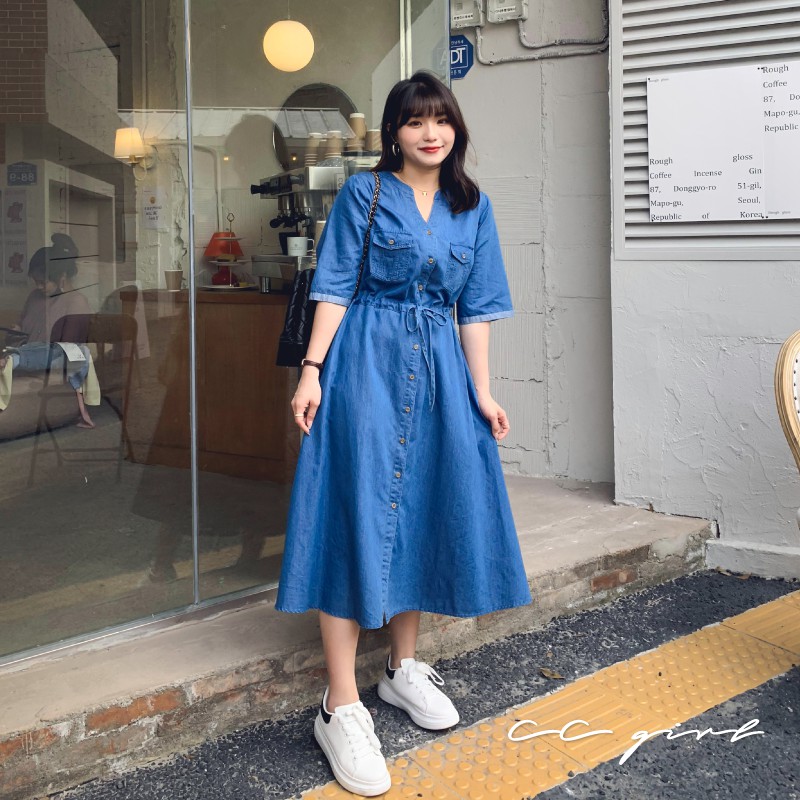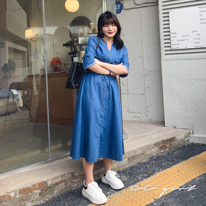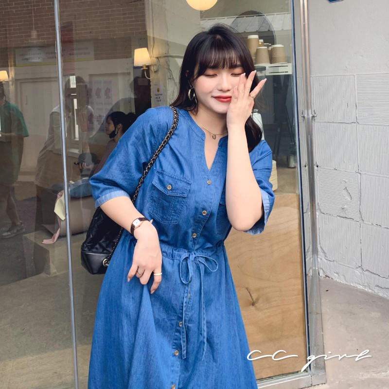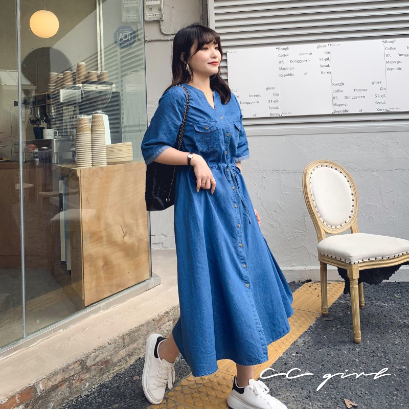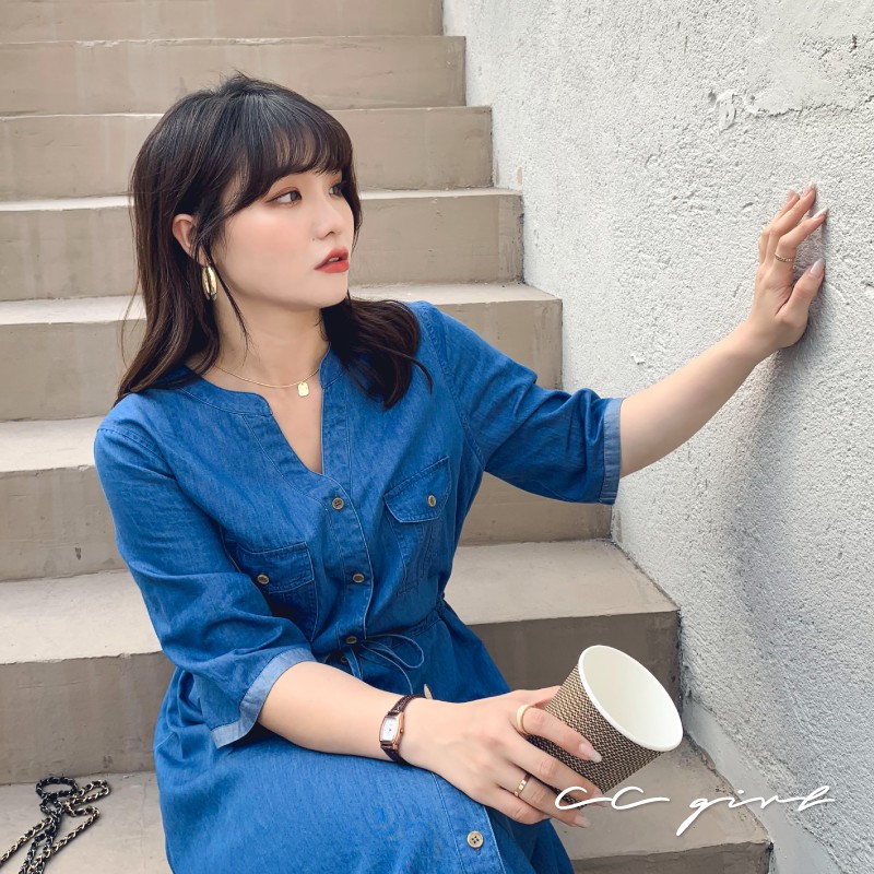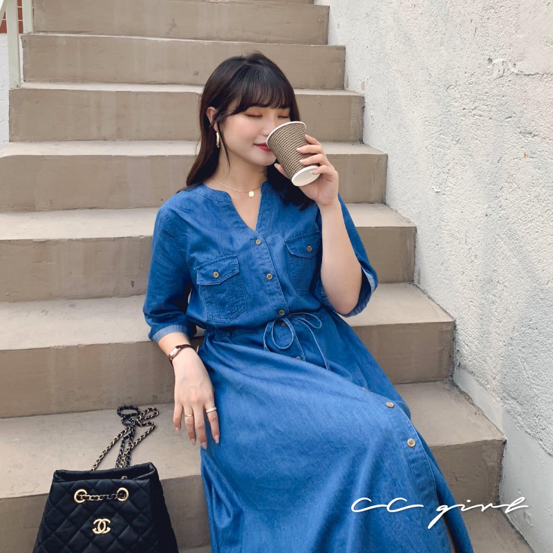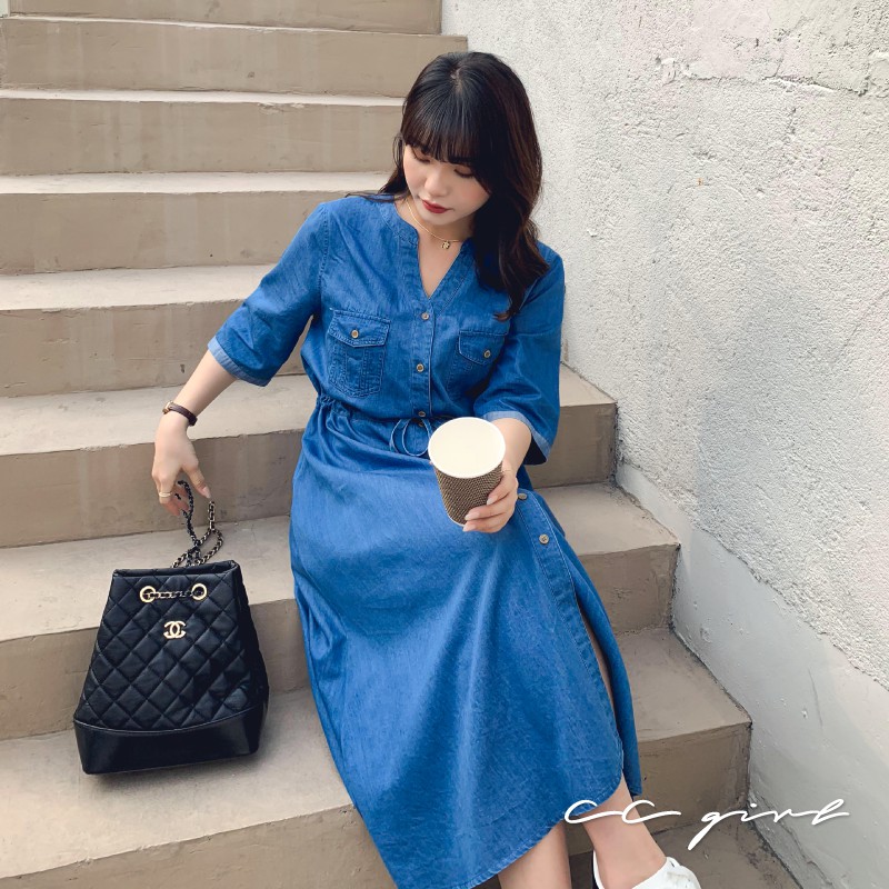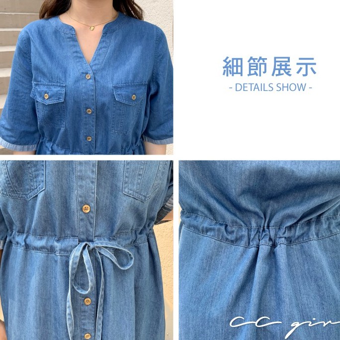 CCGIRL中大尺碼 休閒率性真口袋牛仔排釦修身綁帶V領洋裝 -適M~5L《 91050 》大尺碼女裝 中大尺碼洋裝XL|2L|3L|4L|5L|L|MCCGIRL中大尺碼女裝