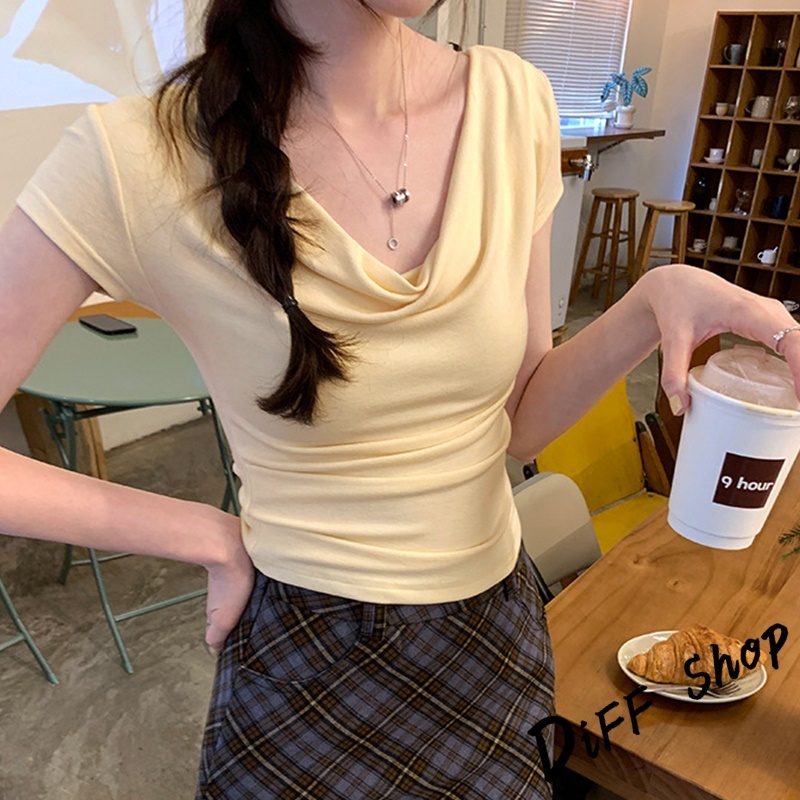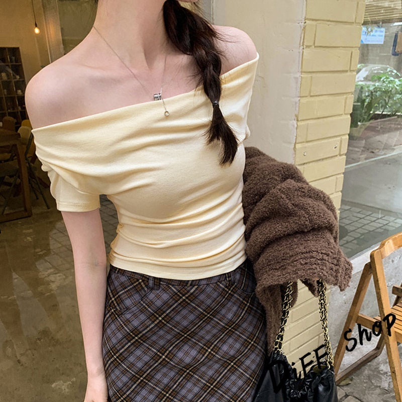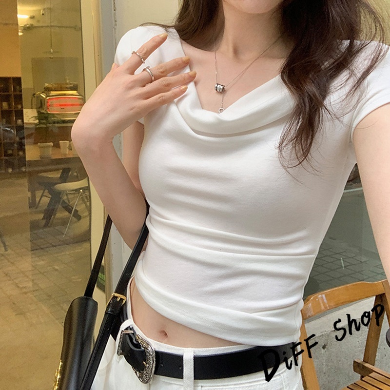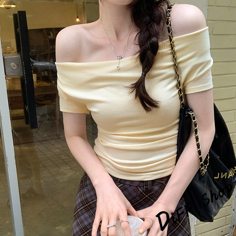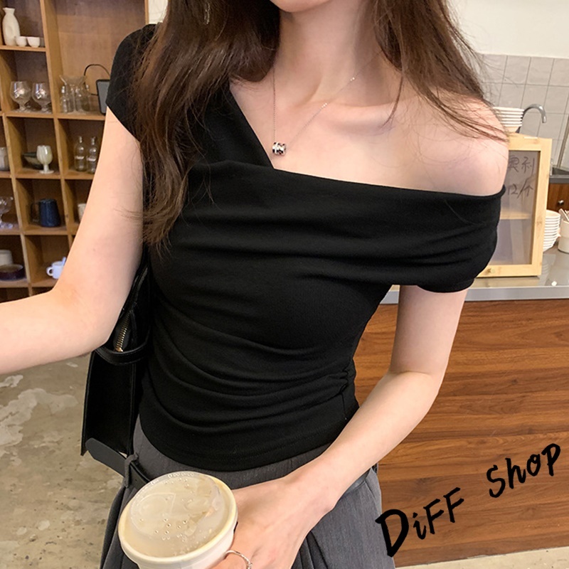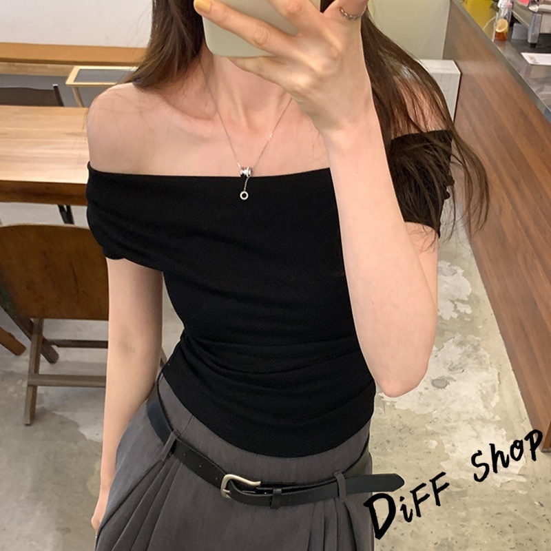 【DIFF】韓版設計感一字領短袖上衣 短版上衣 衣服 夏天女裝 短板上衣 短版t恤 女裝 短袖t恤女【T653】【T653】咖色|【T653】粉色|【T653】白色|【T653】黑色|【T653】杏色T-shirtsDiFF shop