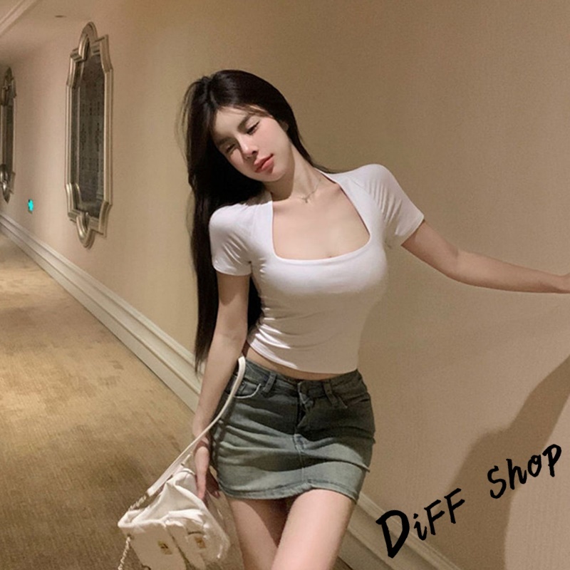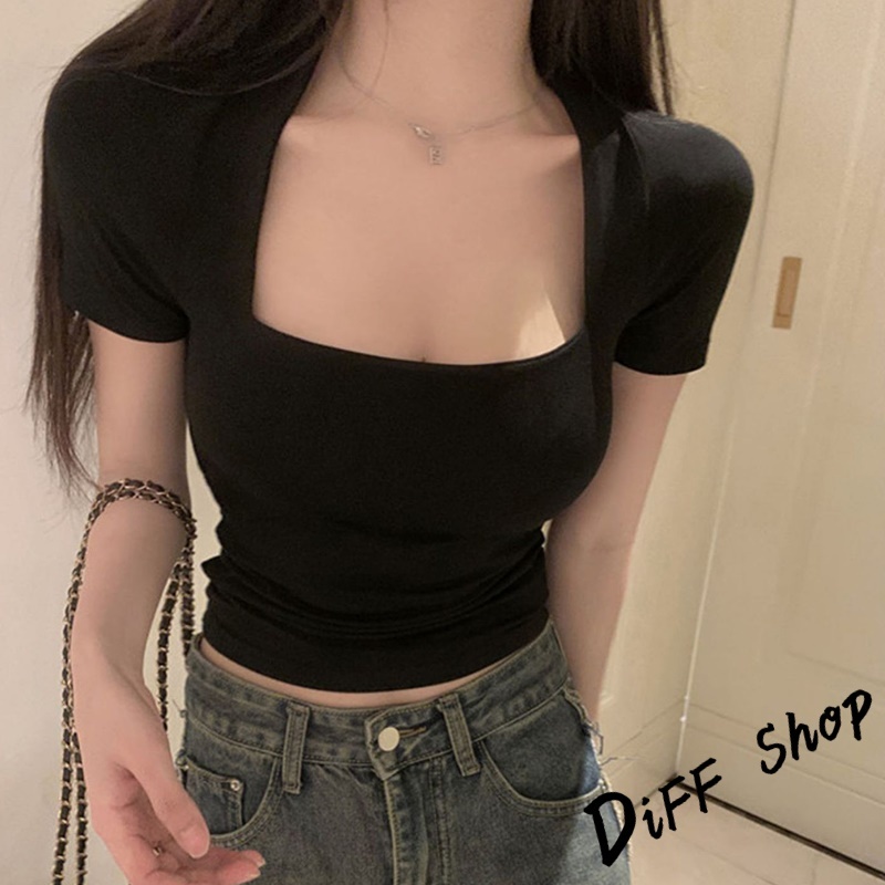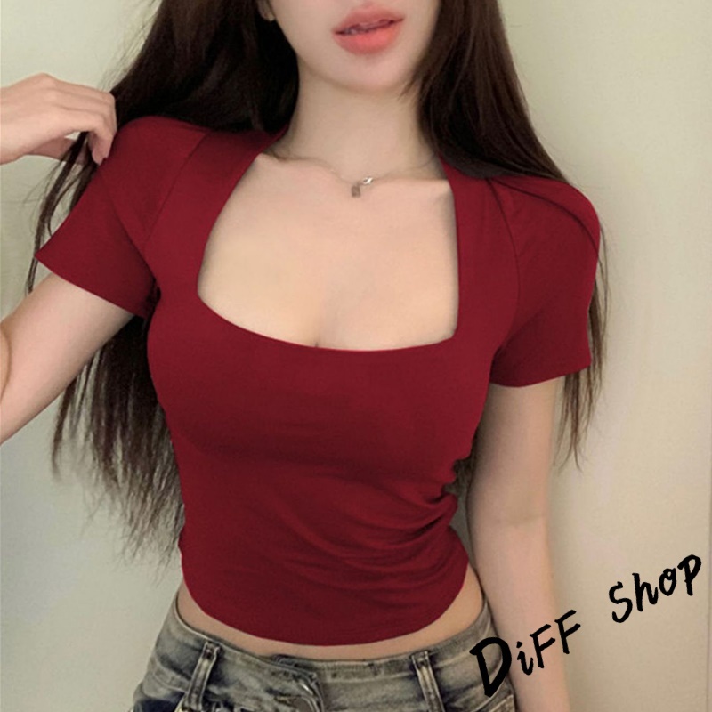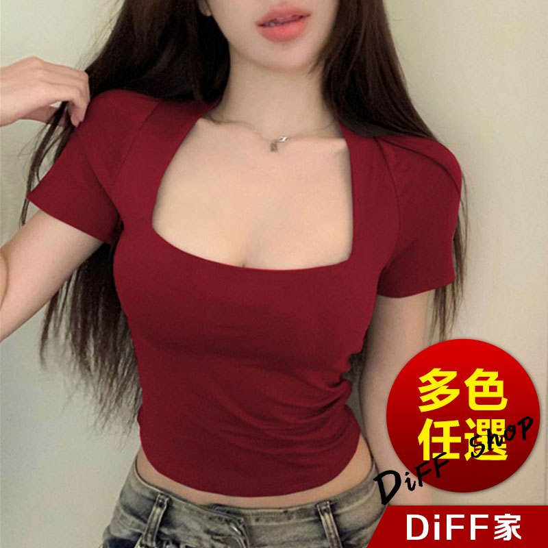 【DIFF】韓版方領修身顯瘦短袖上衣 短版上衣 顯瘦上衣 衣服 夏天女裝 短板上衣 短版t恤 女裝 【T624】【T624】酒紅色|【T624】黑色|【T624】白色T-shirtsDiFF shop