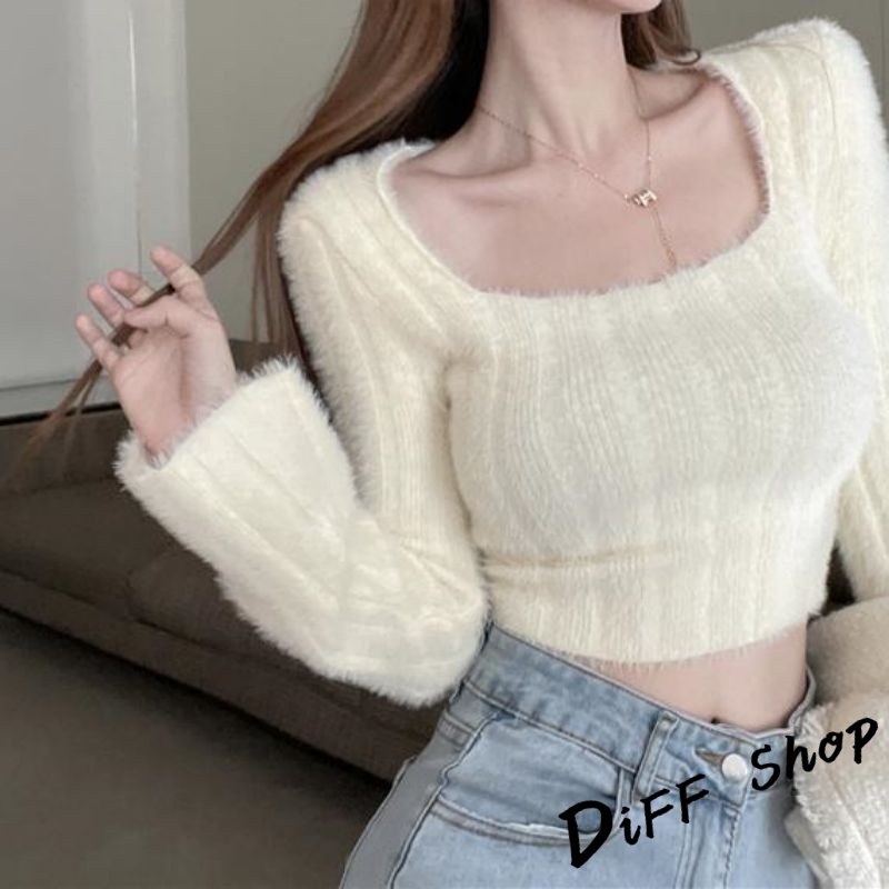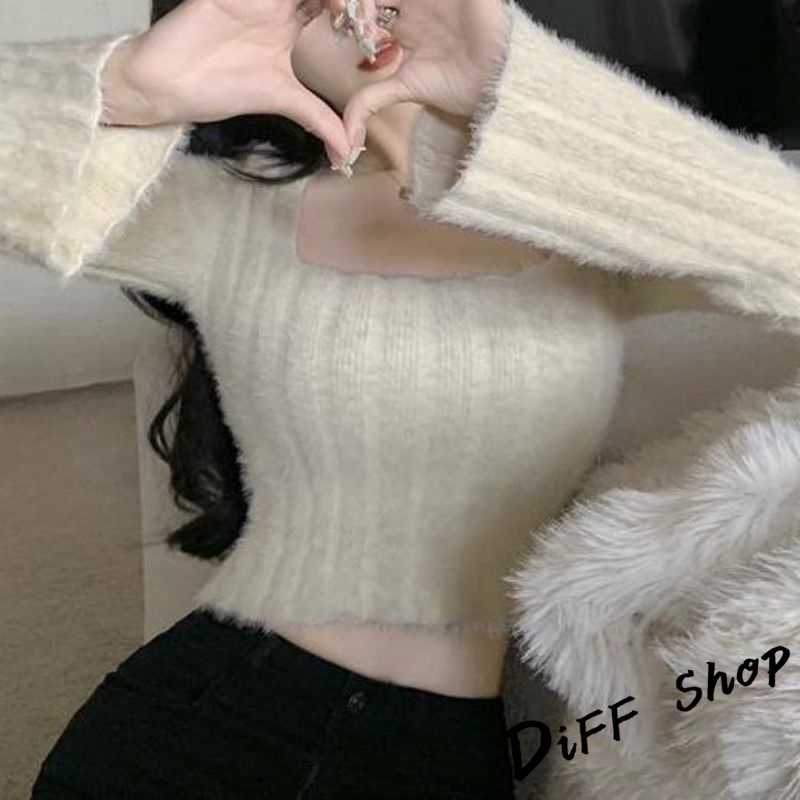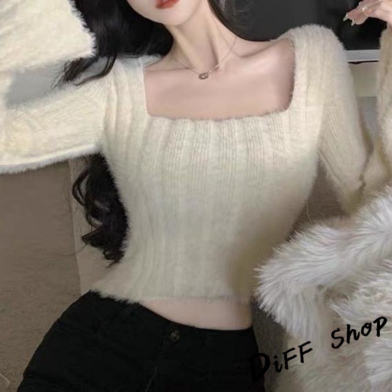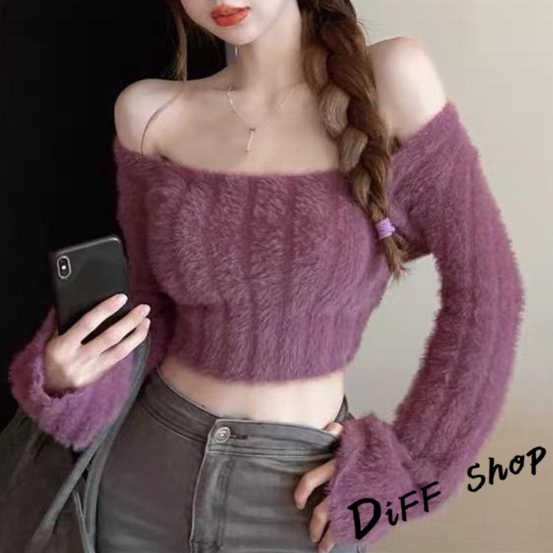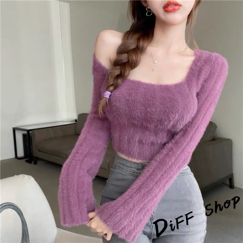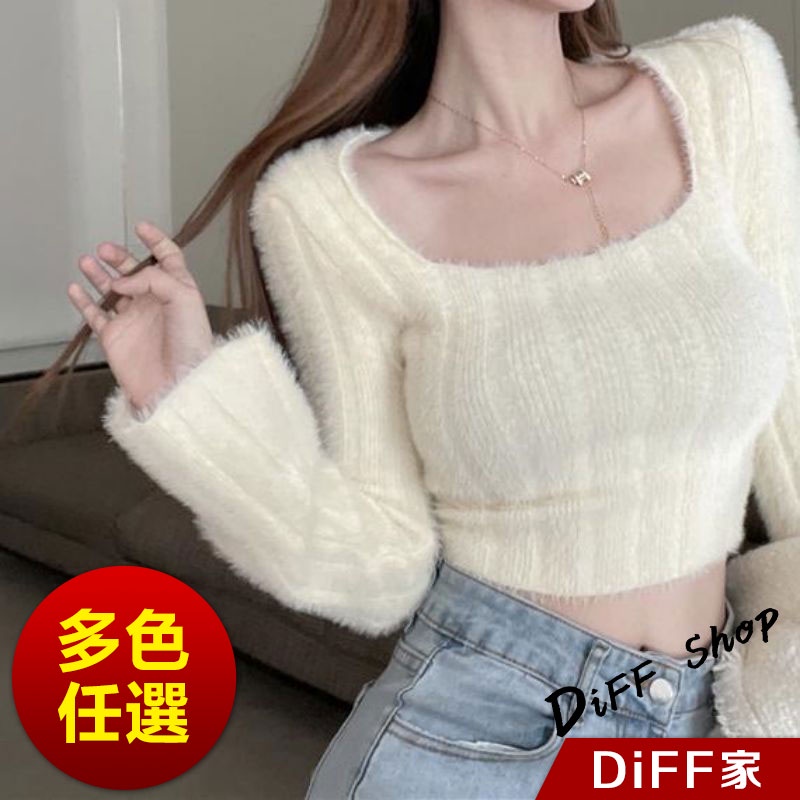 【DIFF】韓版純欲風露鎖骨方領針織上衣 毛衣 短版上衣 長袖上衣 女裝 衣服 發熱衣【W290】【W290】杏色|【W290】紫色DiFF shop