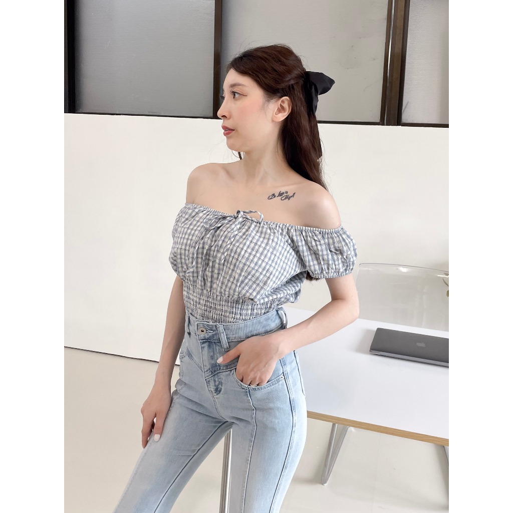 【DOEFF】澎袖縮腰一字領上衣 露肩上衣 短版上衣 平口上衣 短上衣 夏天上衣 短袖上衣 甜美 可愛黑|白|黑格|藍格OthersDOE.FF 朵伊芙