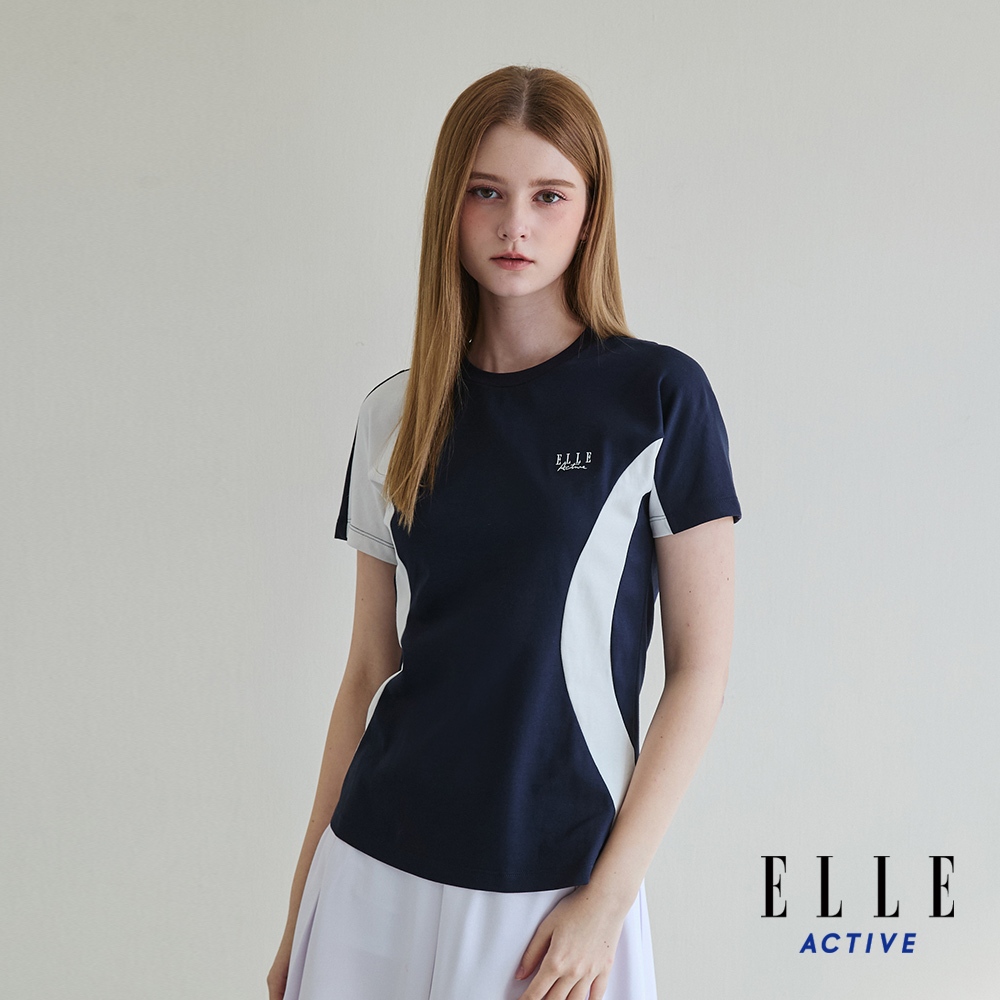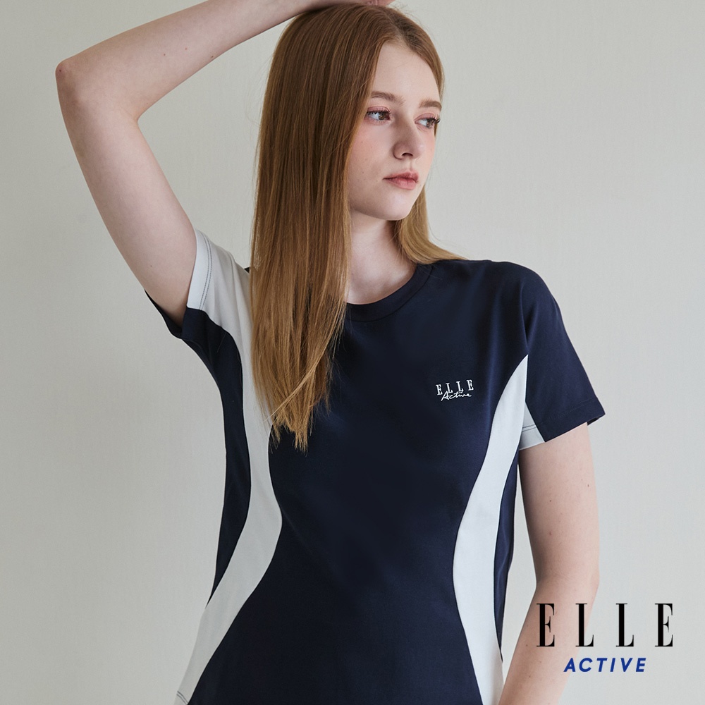 【ELLE ACTIVE】女款 修身剪裁拼色機能短袖T恤-深藍色 (EA25S1W1610-39)L-004|XL-005|S-002|M-003T-shirtsELLE ACTIVE 品牌旗艦館
