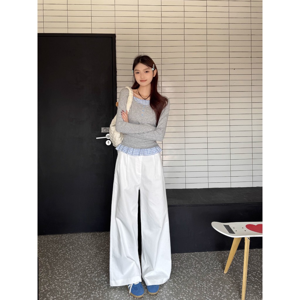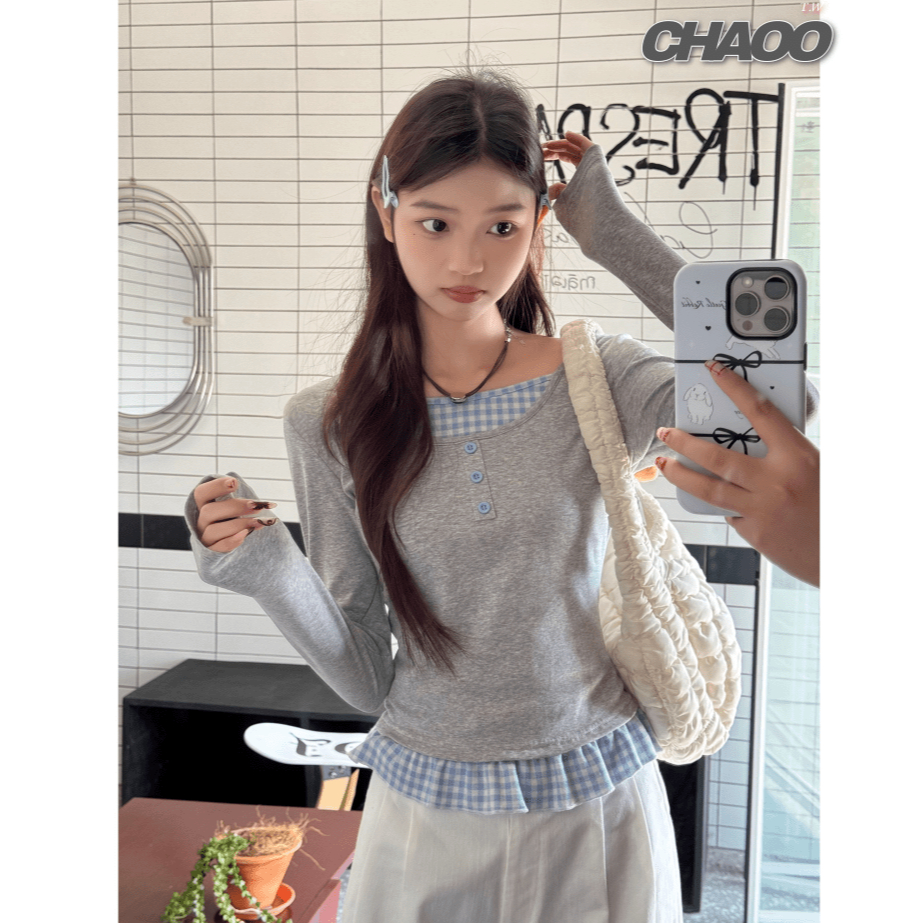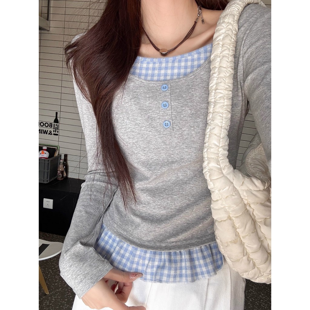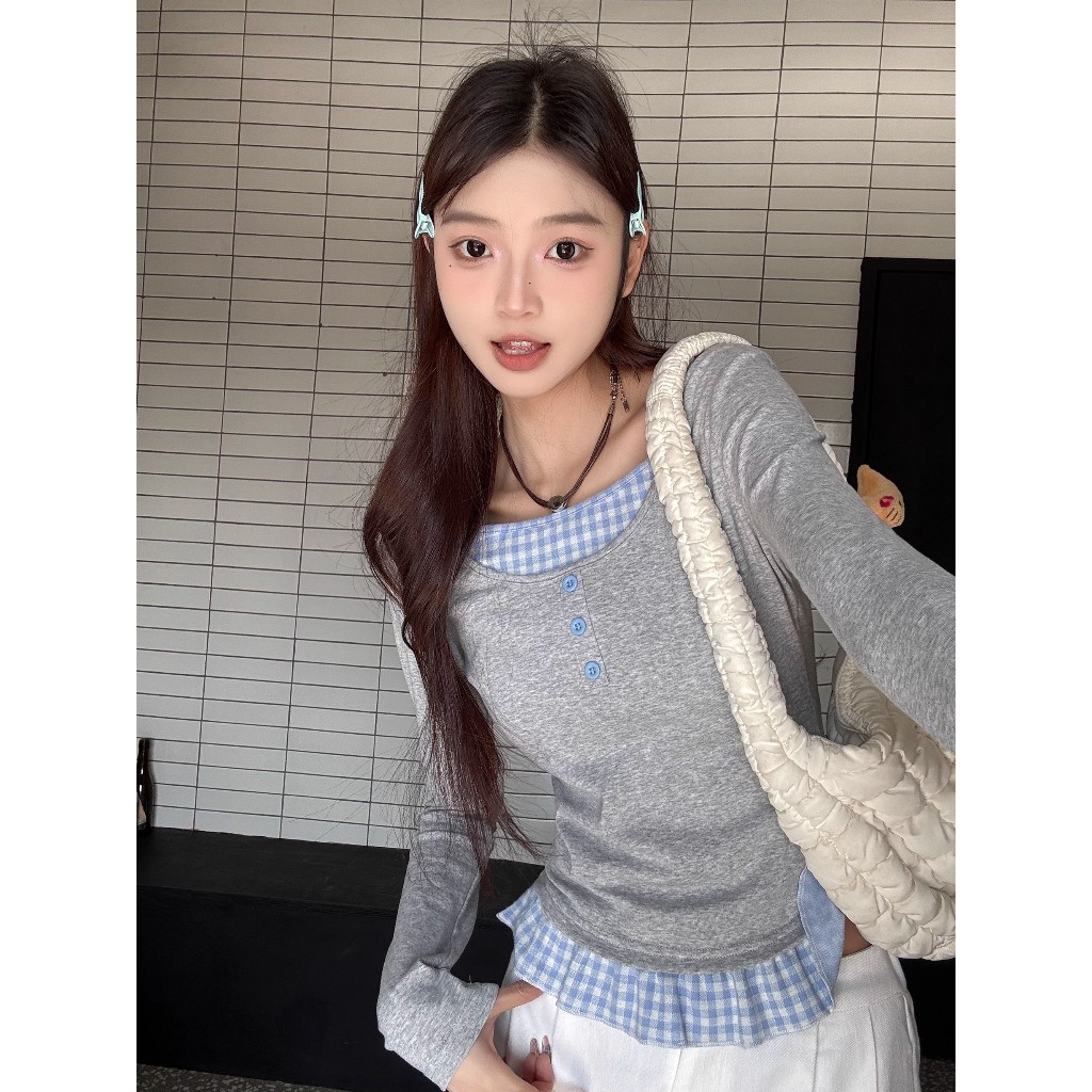 可鹽可甜~有範! 長袖 女 韓版 假兩件 韓系上衣 韓系慵懶風 法式下擺 淺灰拼藍格 y2k 衣服 初秋穿搭 學院風女裝假兩件上衣,F|優質版假兩件上衣,FT-shirtsCHAOO 台北原創服飾品牌