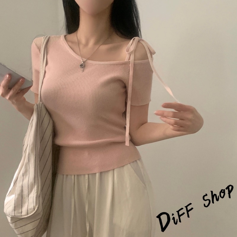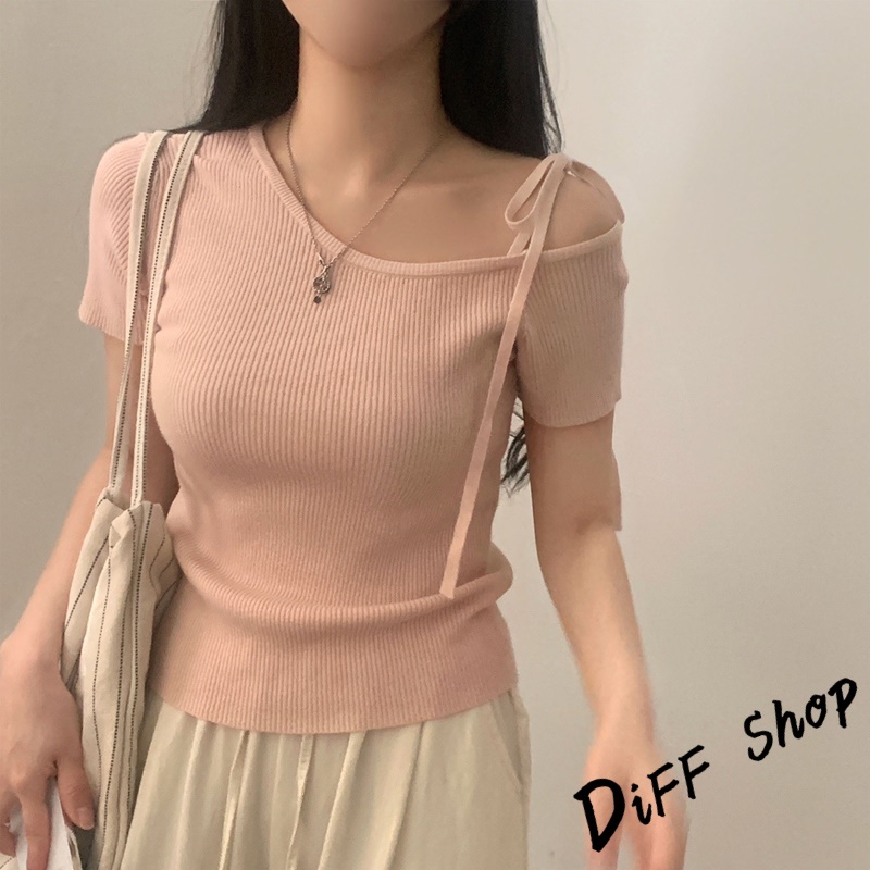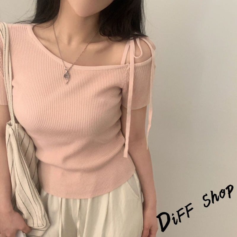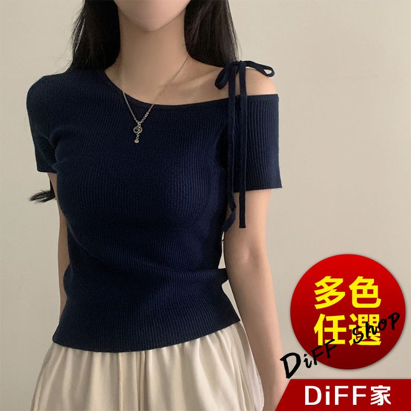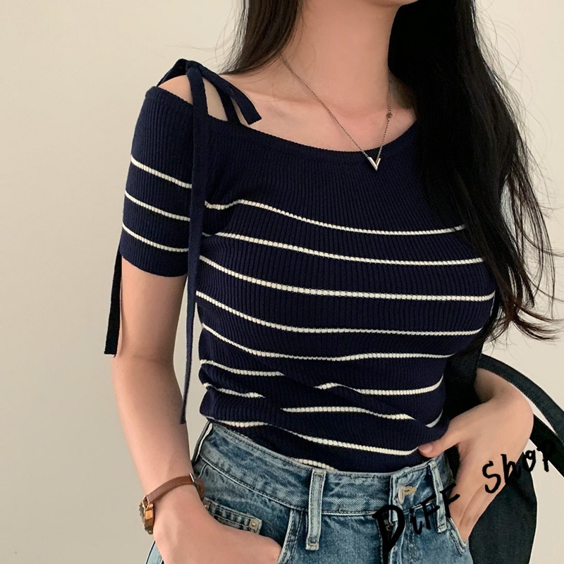 【DIFF】韓版露肩短袖針織上衣 斜肩 短袖上衣 顯瘦上衣 衣服 夏天女裝 短板上衣 女裝 短袖t恤女【T645】【T645】杏色條紋|【T645】藏青條紋|【T645】粉色|【T645】杏色|【T645】藏青T-shirtsDiFF shop