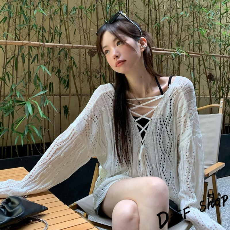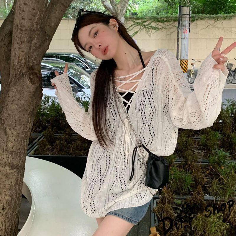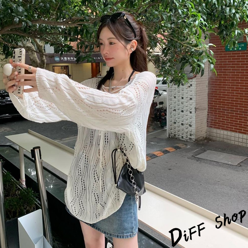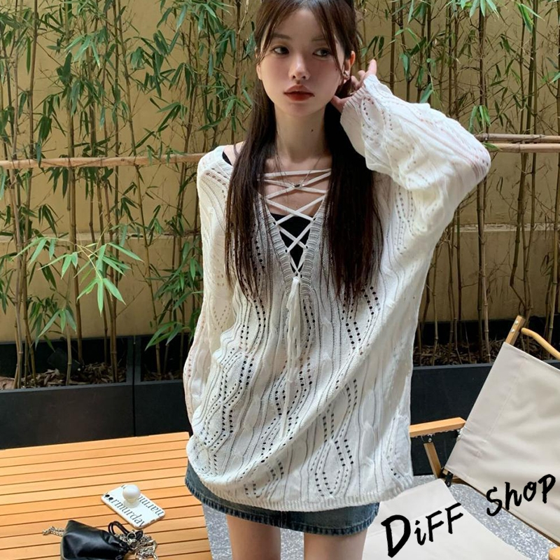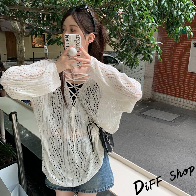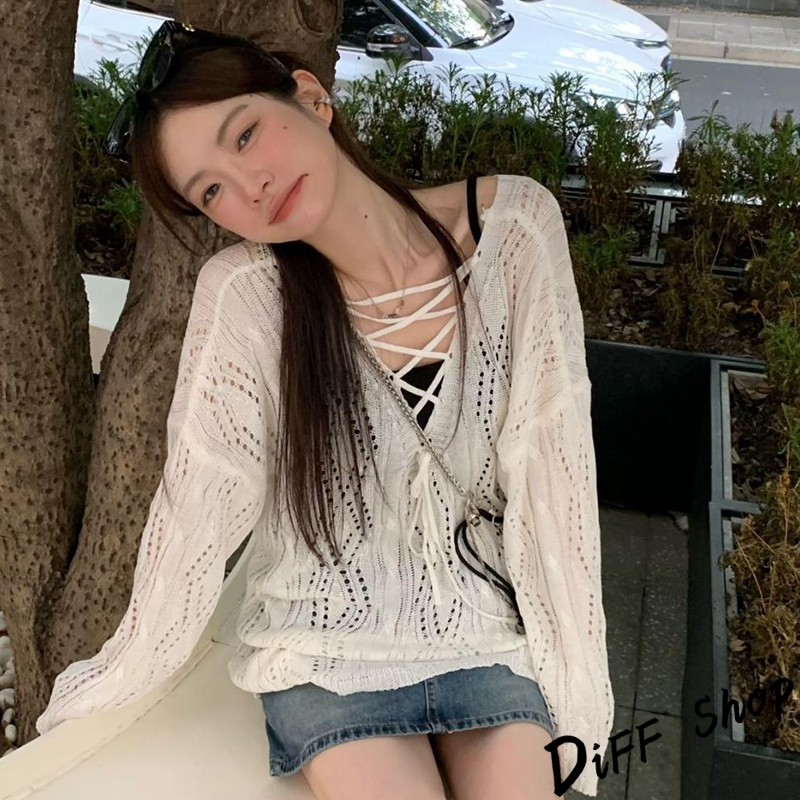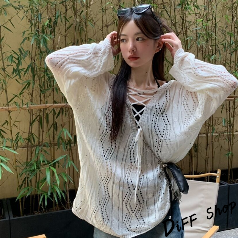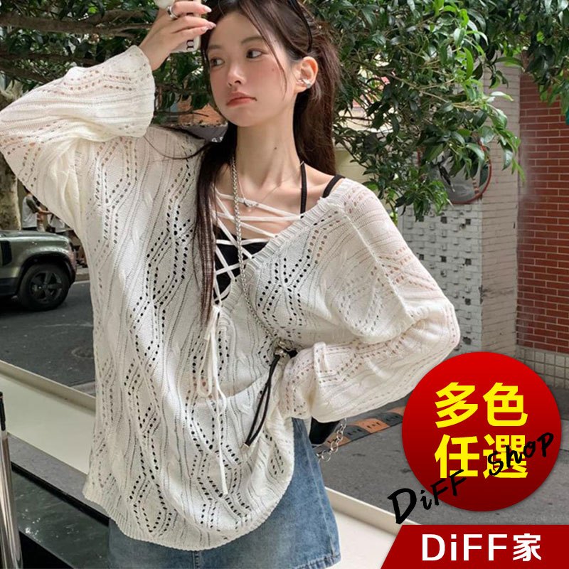 【DIFF】韓版鏤空微透綁帶寬鬆白色針織上衣 長袖上衣 女裝 衣服 寬鬆上衣 顯瘦上衣【W509】【W509】白色DiFF shop