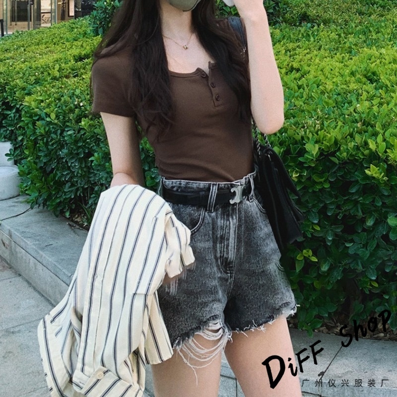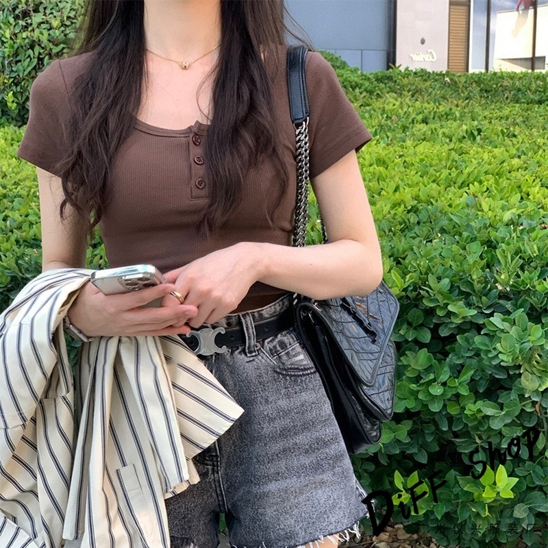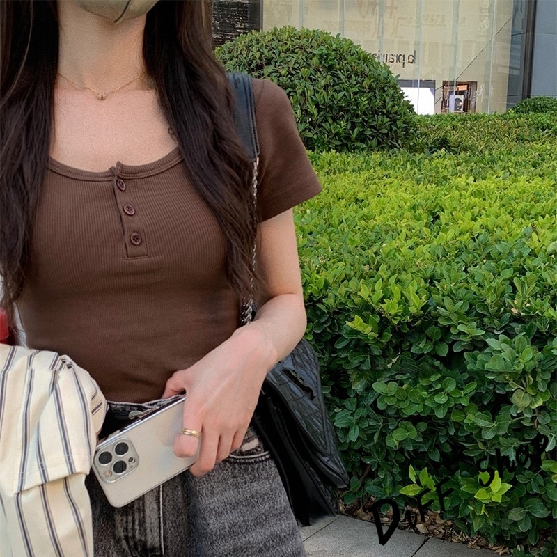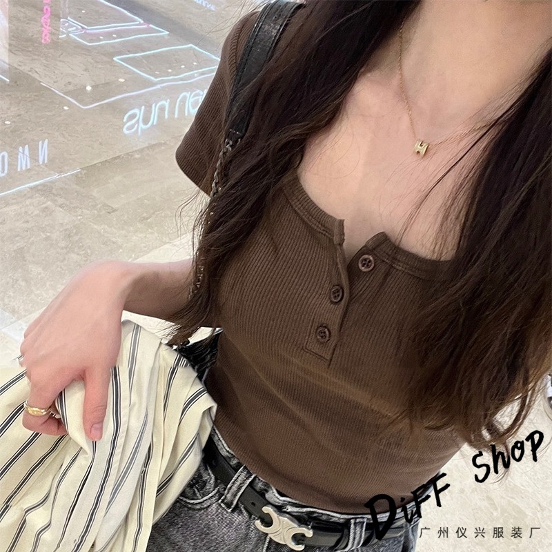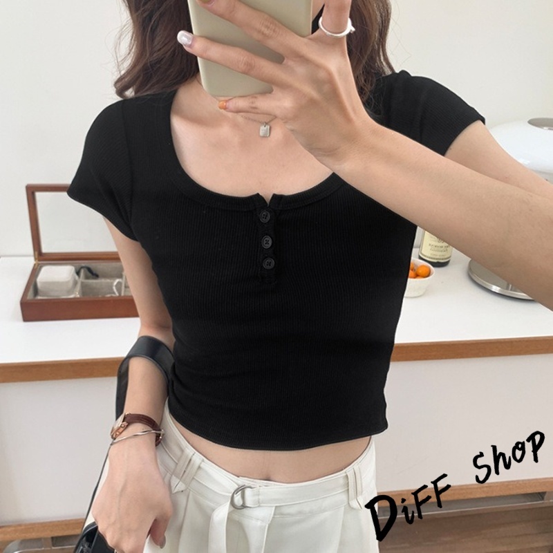 【DIFF】韓版美式復古鈕扣短袖上衣 衣服 夏天女裝 短板上衣 短版t恤 女裝 短袖t恤女 短版上衣 【T668】【T668】白色|【T668】淺灰色|【T668】黑色|【T668】咖色|【T668】橘紅色T-shirtsDiFF shop