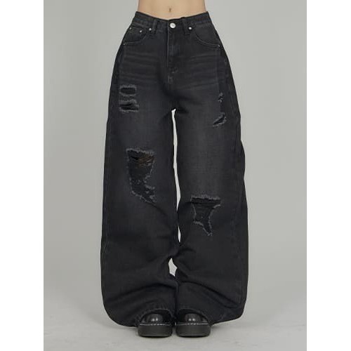 Codibook|韓國 EEZEE 刷破寬版牛仔長褲DE028 [預購]牛仔褲 女裝黑色,S|黑色,M|黑色,L|黑色,XLCodibook 韓國女裝購物平台