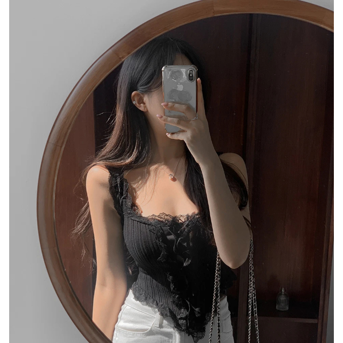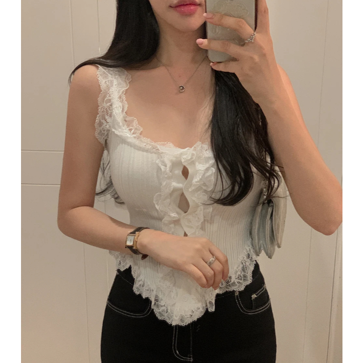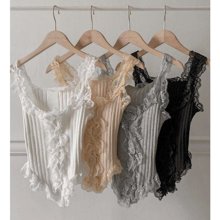 Codibook|韓國 secon’de secon 蕾絲荷葉邊針織背心[預購]無袖 雪紡襯衫 女裝米褐色|灰色|黑色|象牙白Tanks & CamisolesCodibook 韓國女裝購物平台