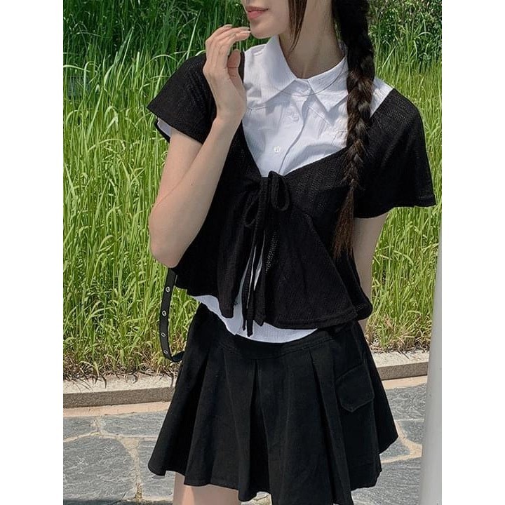 Codibook|韓國 anyonemore 荷葉邊短版綁帶短袖開衫2色[預購]針織外套 雪紡襯衫 女裝free,象牙白|free,黑色Winter Jackets & CoatsCodibook 韓國女裝購物平台