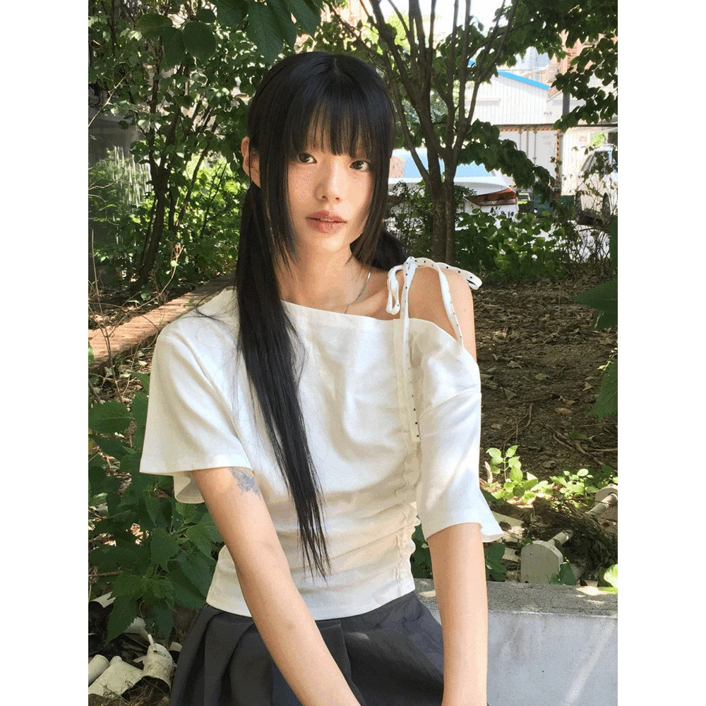 Codibook|韓國 wonderwonder 點點抽繩露肩褶皺短袖T恤[預購]短袖上衣 女裝白色,FREE|黑色,FREET-shirtsCodibook 韓國女裝購物平台