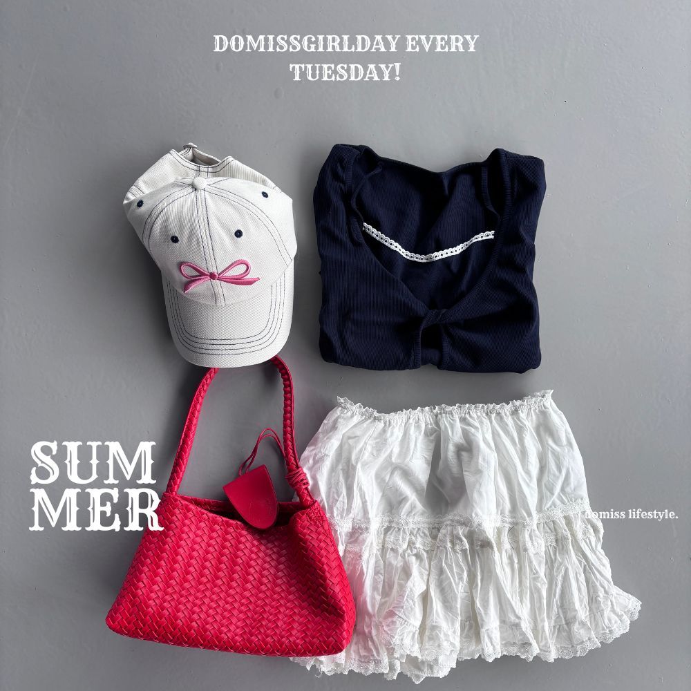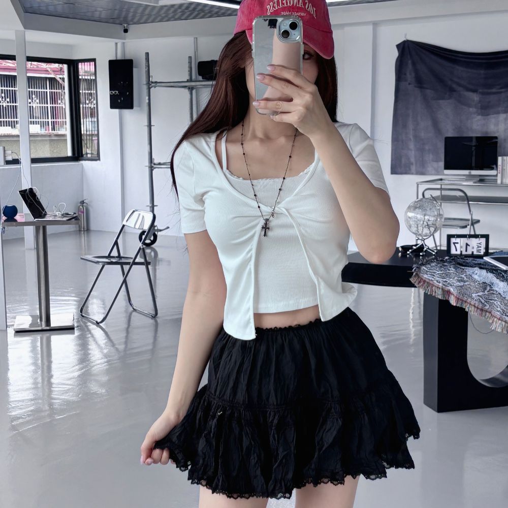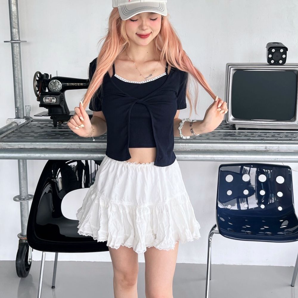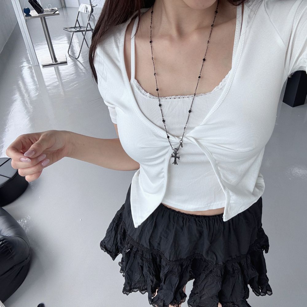 【DOMISS自訂】蕾絲紐結假兩件短袖上衣-3色(現貨)深藍色|灰色|白色T-shirtsDOMISS 朵蜜絲