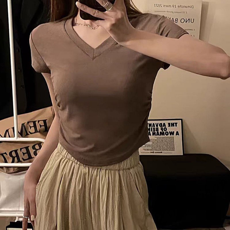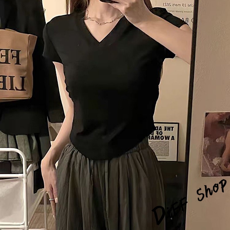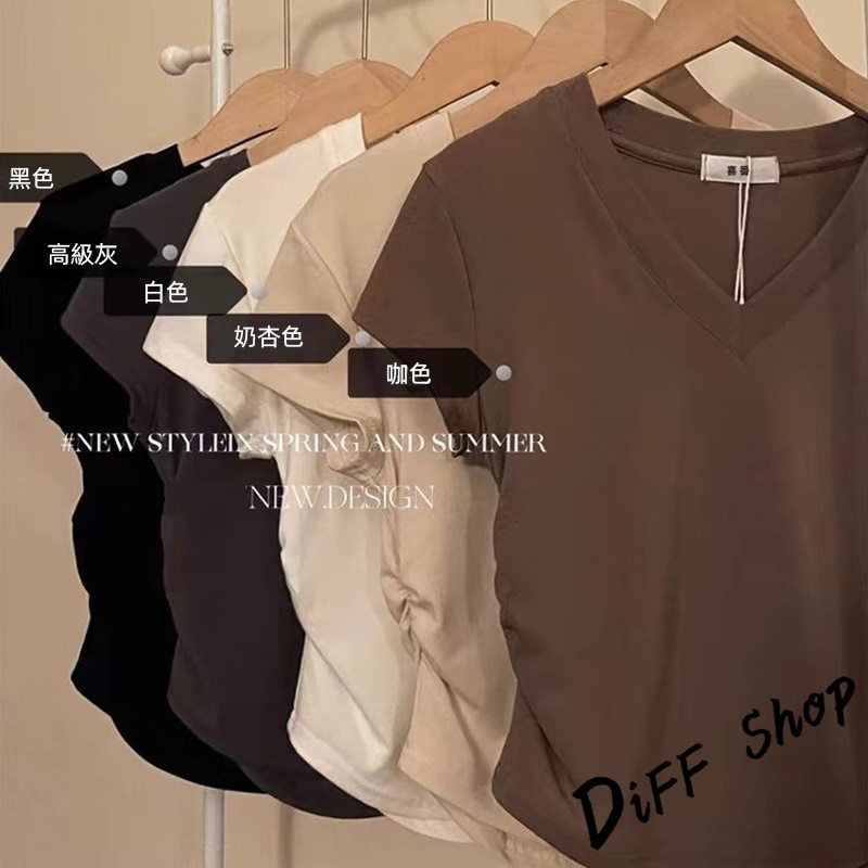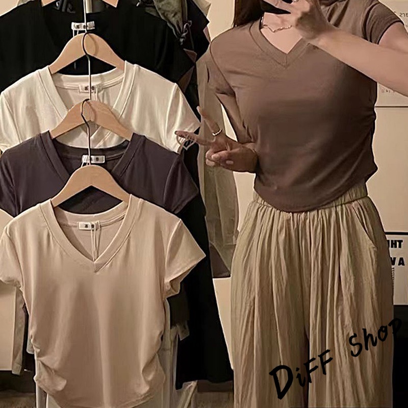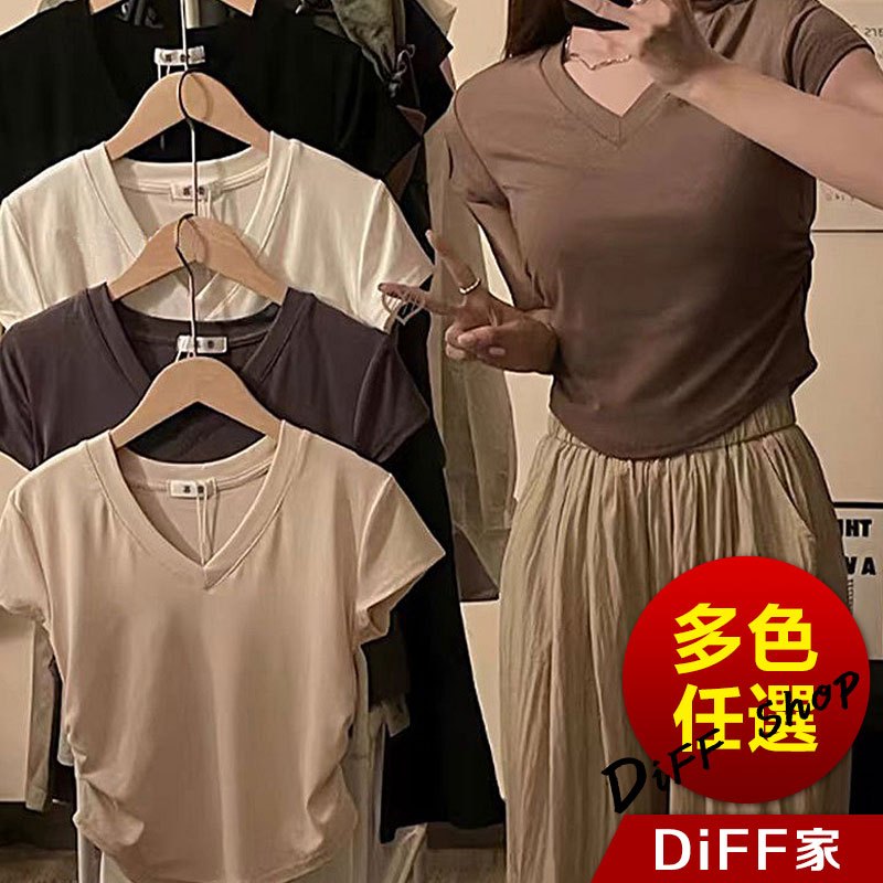 【DIFF】韓版收腰設計感V領短袖上衣 短版上衣 衣服 夏天女裝 短板上衣 短版t恤 女裝 短袖t恤女【T663】【T663】杏色|【T663】白色|【T663】黑色|【T663】灰色|【T663】咖色T-shirtsDiFF shop