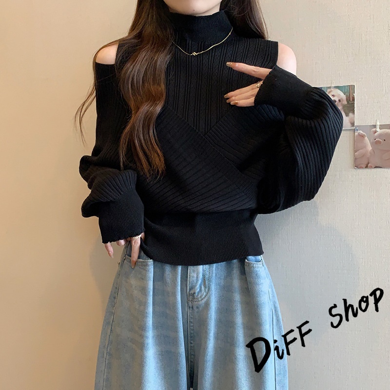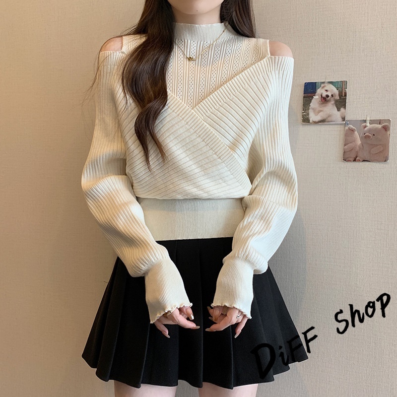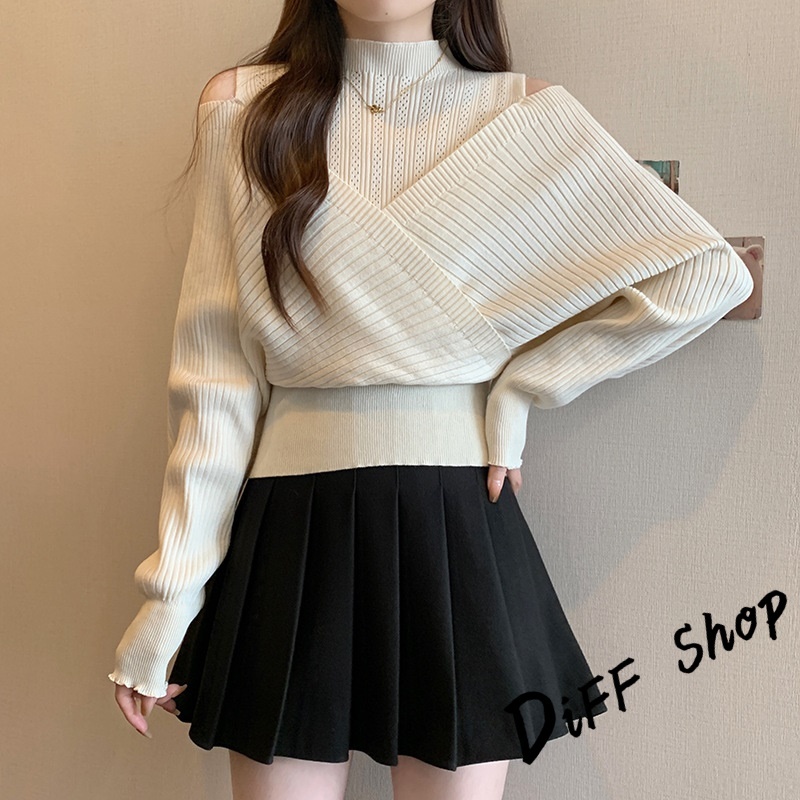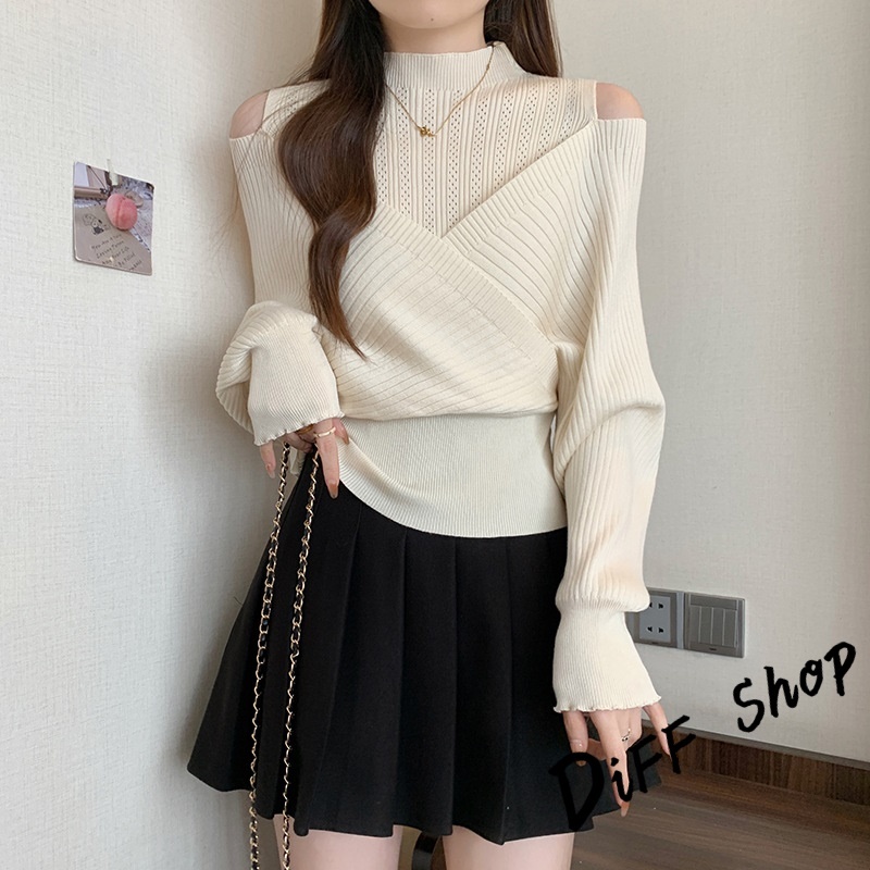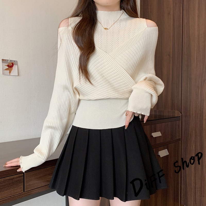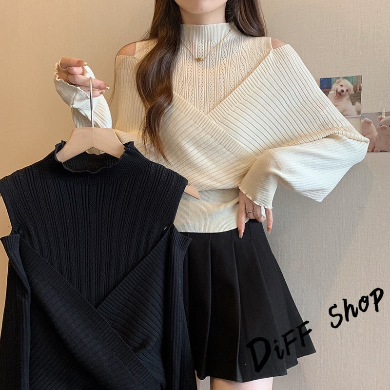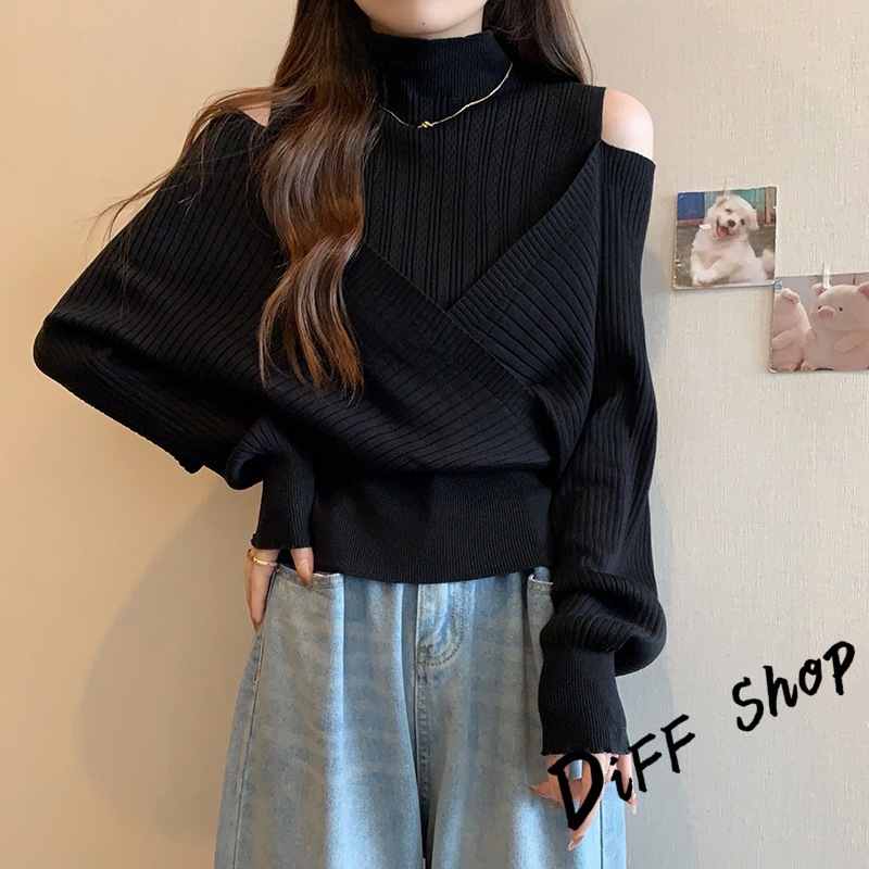 【DIFF】韓版氣質露肩半高領顯瘦假兩件針織上衣 毛衣 長袖上衣 女裝 衣服 發熱衣 保暖上衣 冬裝【W535】【W535】黑色|【W535】杏色DiFF shop