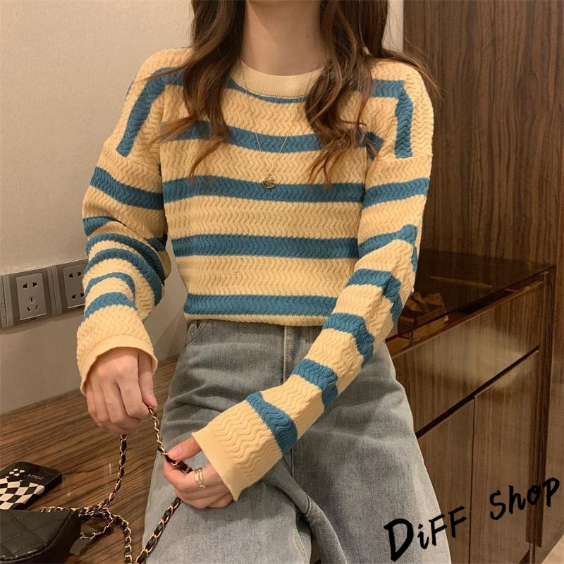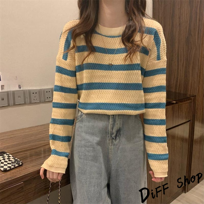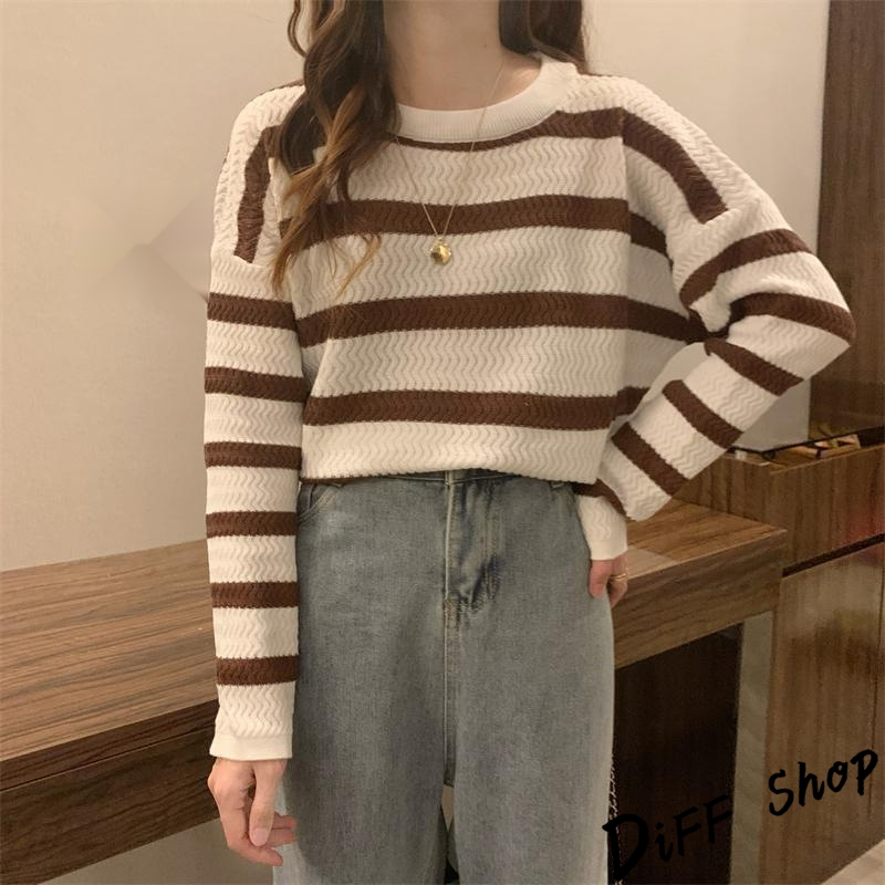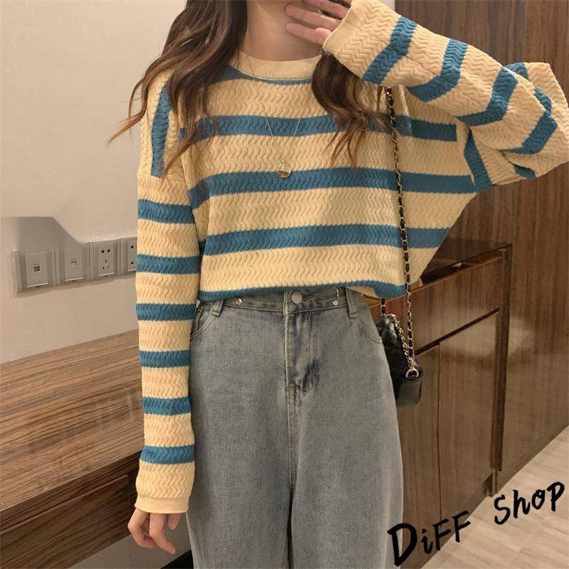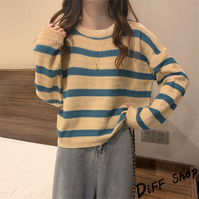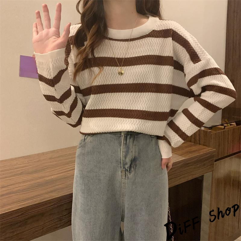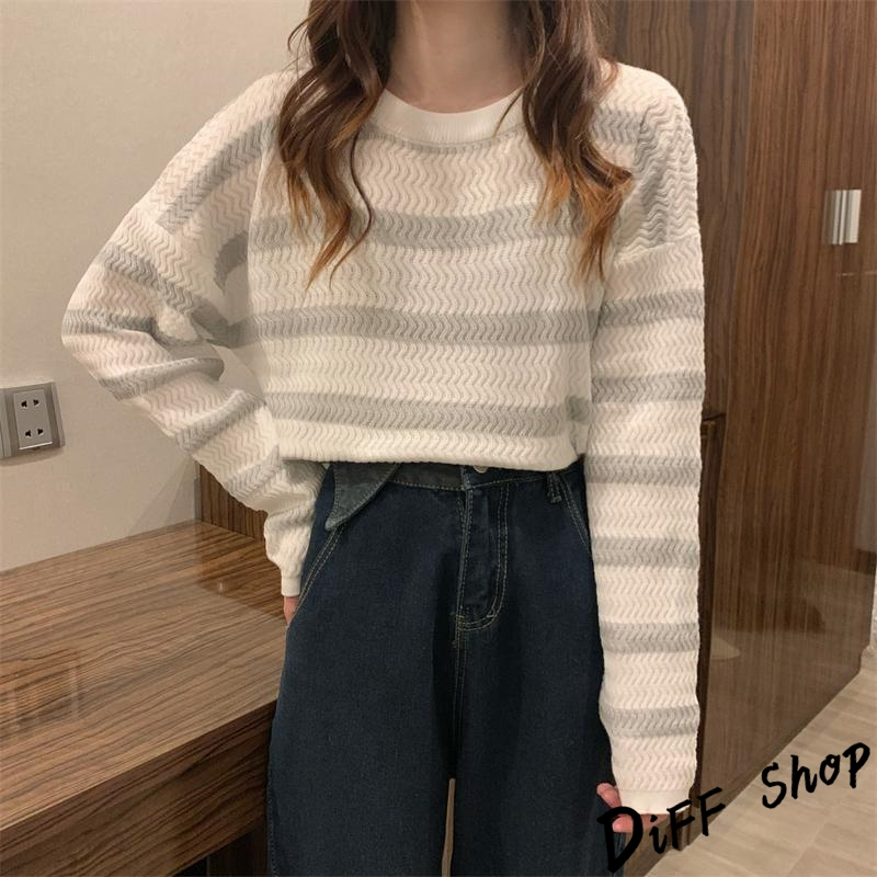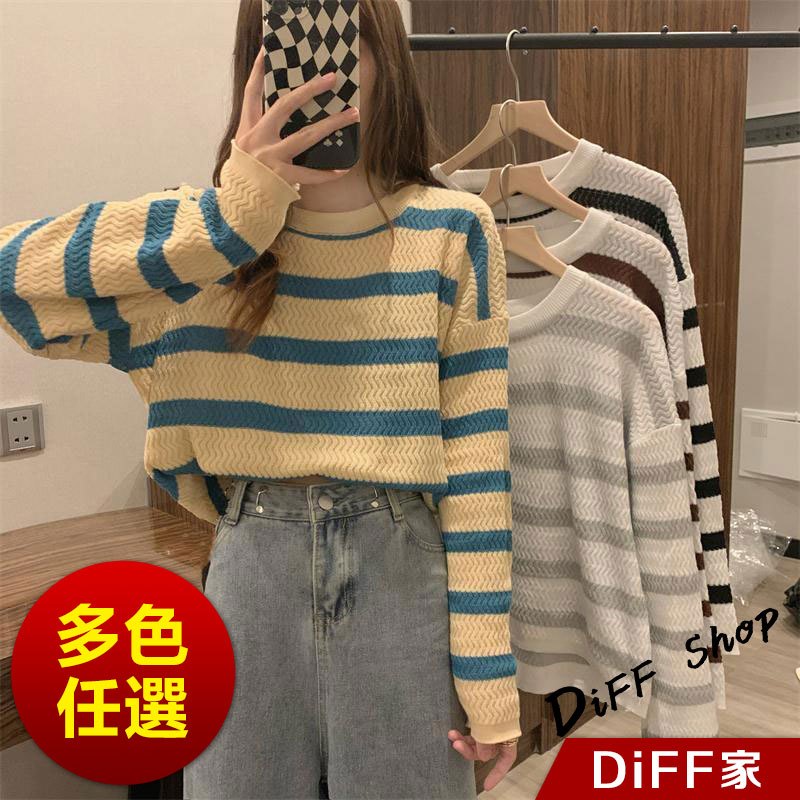 【DIFF】韓版溫柔系條紋寬鬆針織上衣 毛衣 長袖上衣 女裝 衣服 寬鬆上衣 顯瘦上衣 長袖t恤【W491】【W491】灰色條紋|【W491】杏藍條紋|【W491】咖色條紋DiFF shop