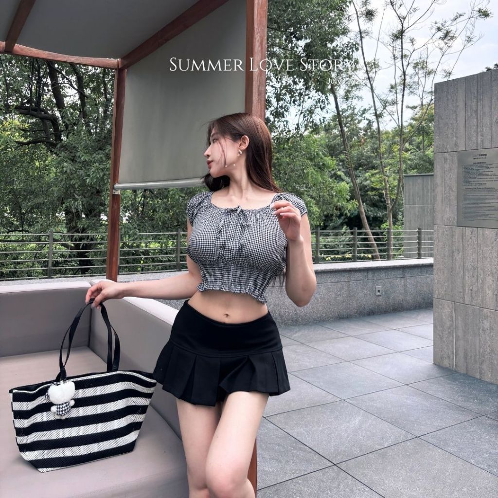 【甜美黑白格紋】DOMISS 縮腰抓皺上衣|度假女友感上衣 必收夏日短版款(現貨)