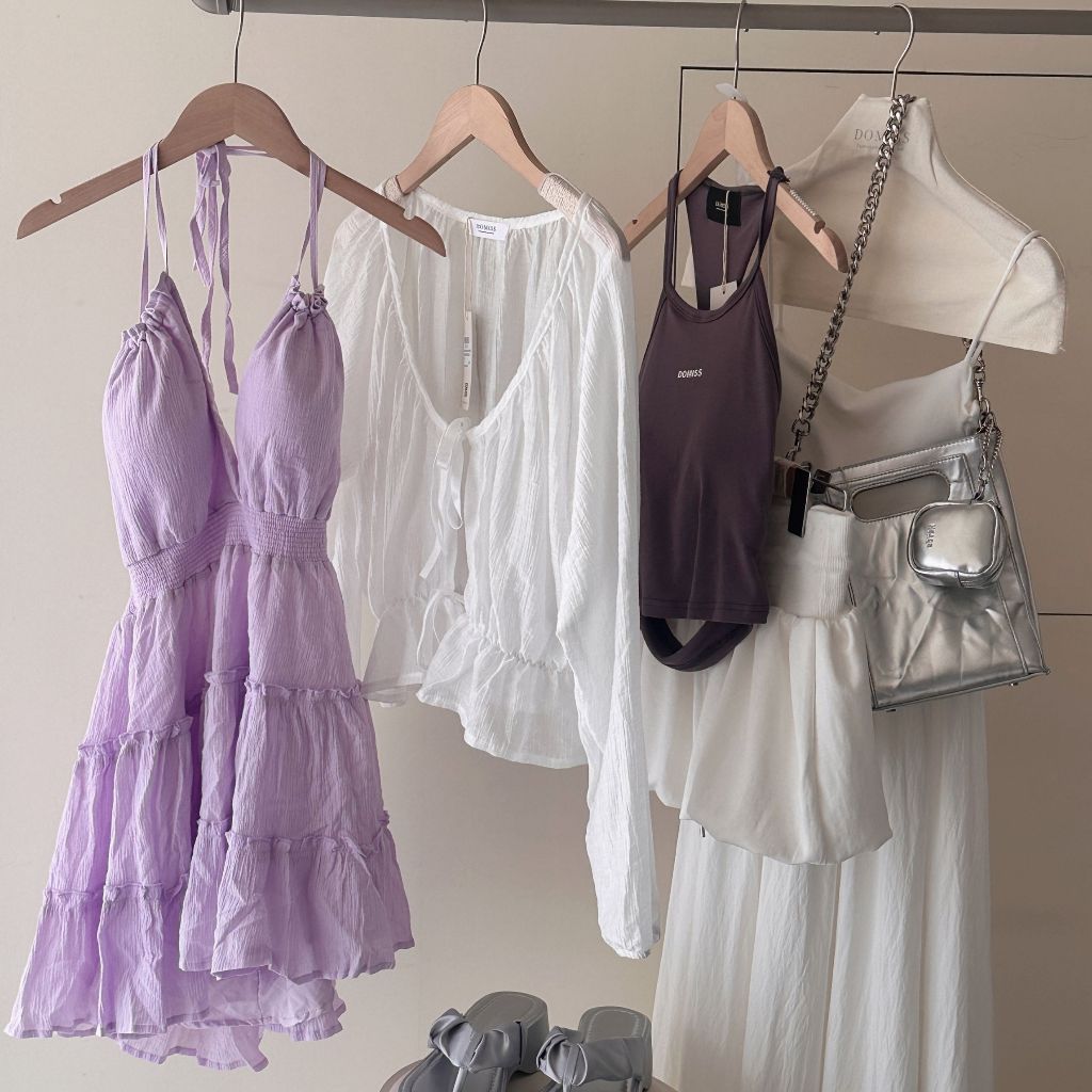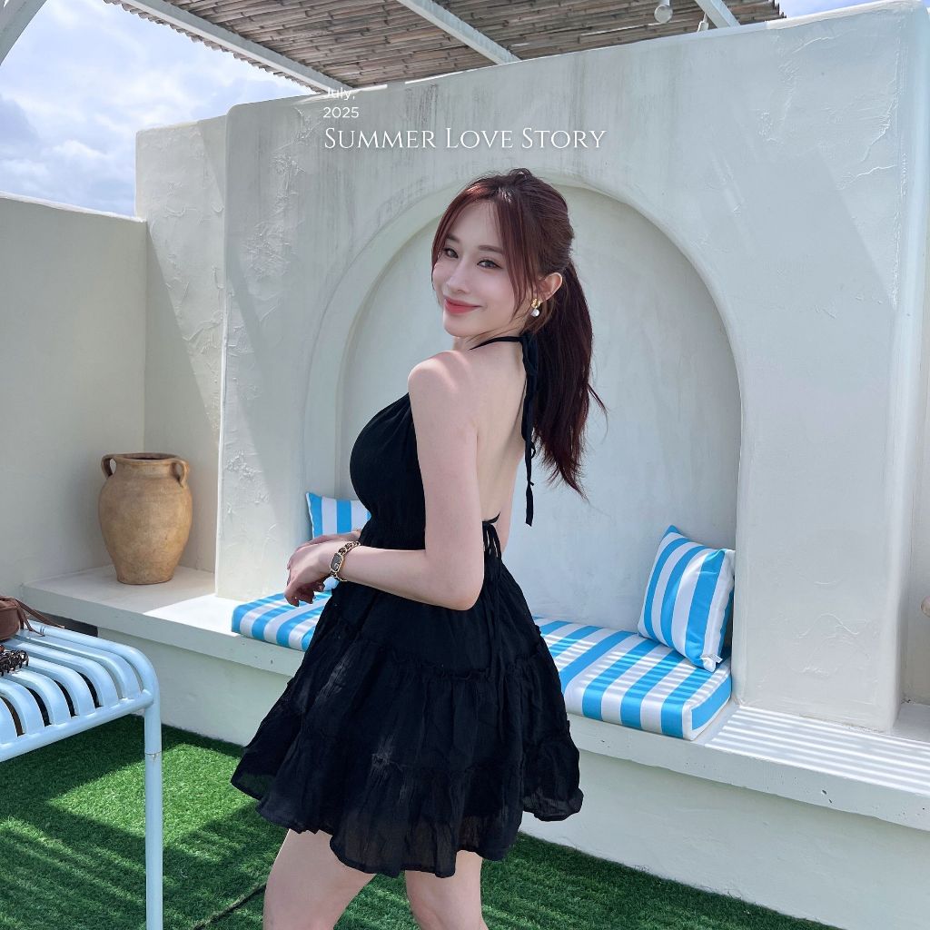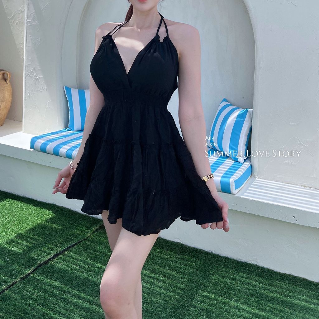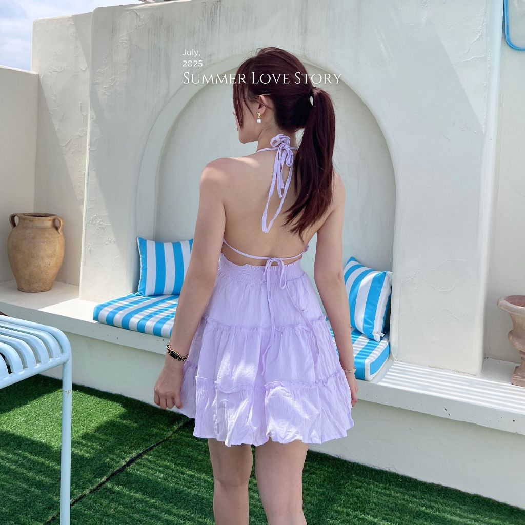 【希臘度假感】DOMISS掛脖吊帶綁帶洋裝 連身裙 澎澎裙洋裝-2色(現貨)薰衣草紫|黑色DOMISS 朵蜜絲