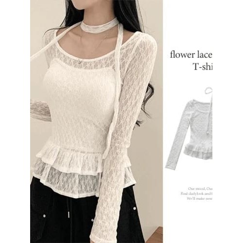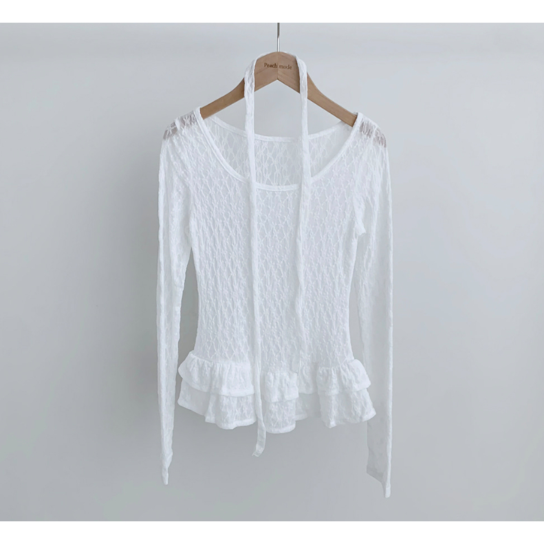 Codibook|韓國 peachmode 蕾絲花朵透膚圓領分層荷葉邊長袖上衣[預購]長袖上衣 雪紡襯衫 女裝白色,FREET-shirtsCodibook 韓國女裝購物平台