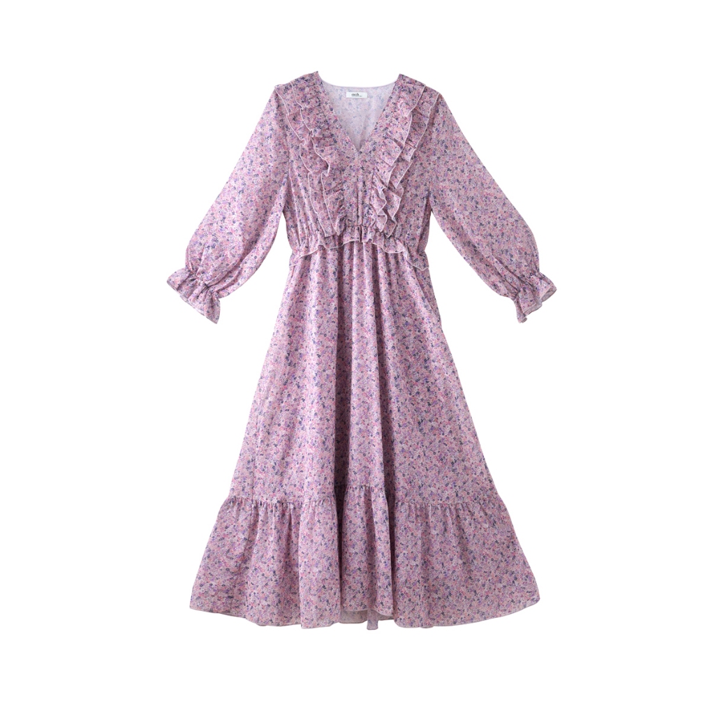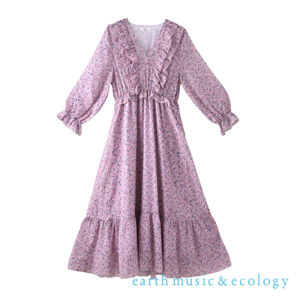 earth music&ecology 胸前荷葉邊裝飾V領洋裝(0S000005700)黑色F|紫色Fearth music&ecology Select Store