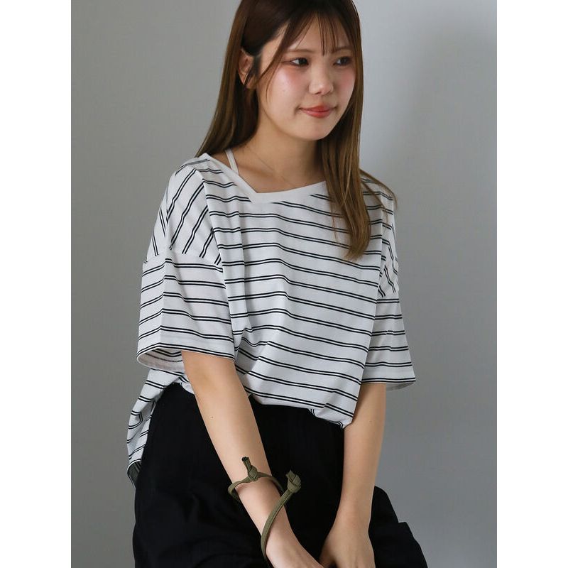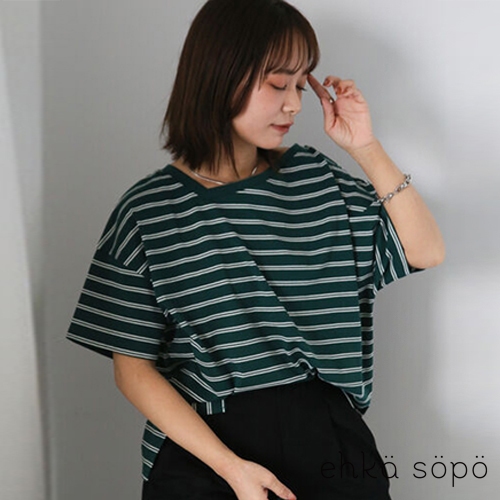 ehka sopo 橫條紋斜肩V領造型短袖上衣(0F000885910)本白F|黑色F|紅色F|綠色FT-shirtsearth music&ecology Select Store