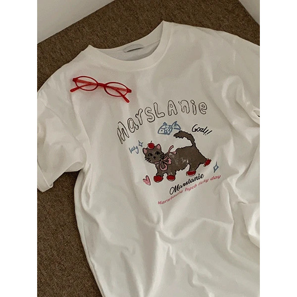 Codibook|韓國 moodloveroom 蘋果貓咪寬鬆短袖T恤[預購]短袖上衣 女裝象牙白,FreeT-shirtsCodibook 韓國女裝購物平台