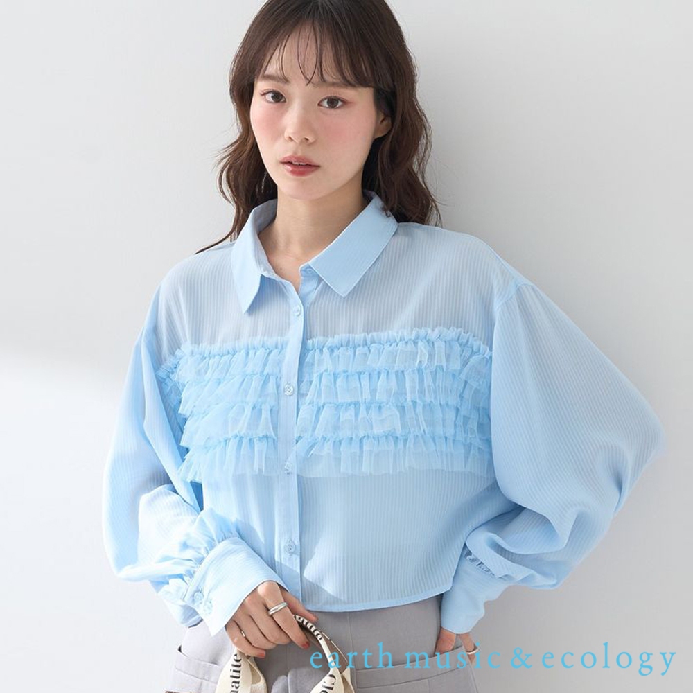 earth music&ecology 薄紗荷葉摺邊拼接短版透膚襯衫(01000299800)本白F|棕色F|淡青色FShirts & Blousesearth music&ecology Select Store