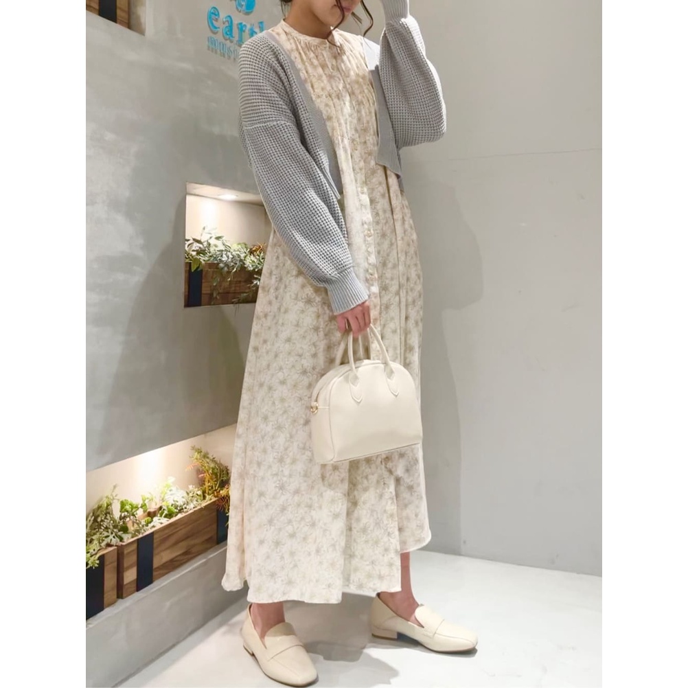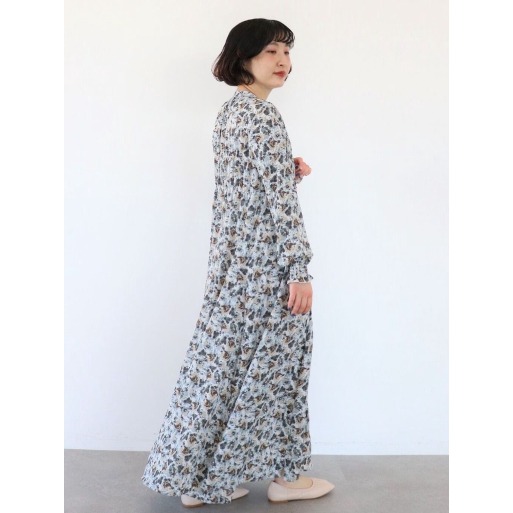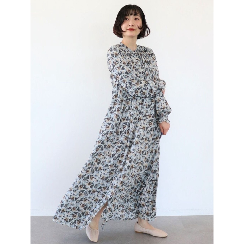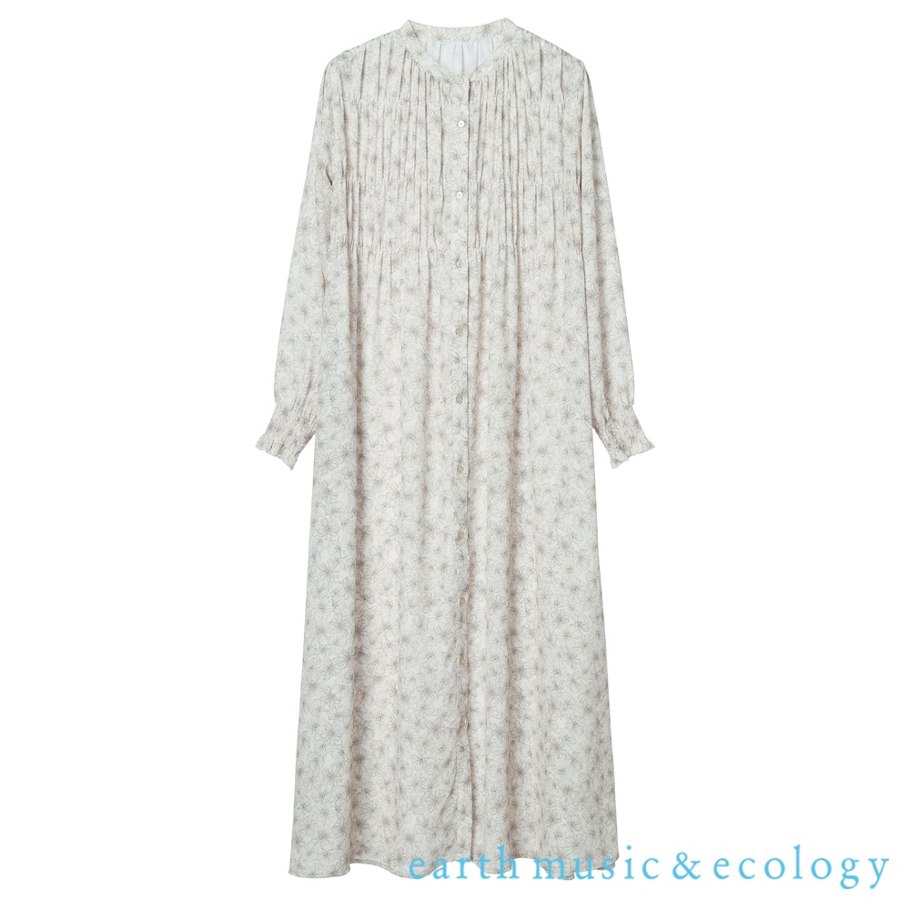 earth music&ecology 印花圖案抓摺開襟長袖洋裝(1B21L0H0640)米色F|淡青色Fearth music&ecology Select Store