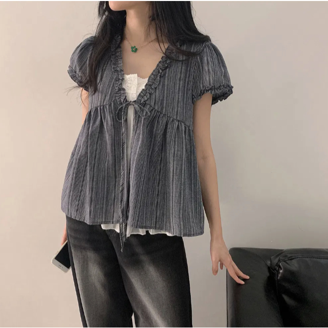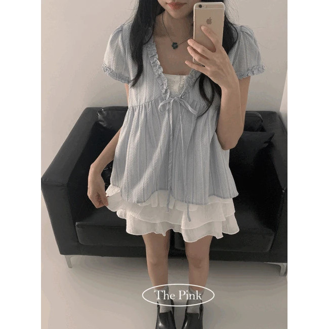 Codibook|韓國 thepink 直條紋荷葉邊緞帶短袖女衫[預購]雪紡襯衫 女裝天空藍,free|海軍藍,freeShirts & BlousesCodibook 韓國女裝購物平台