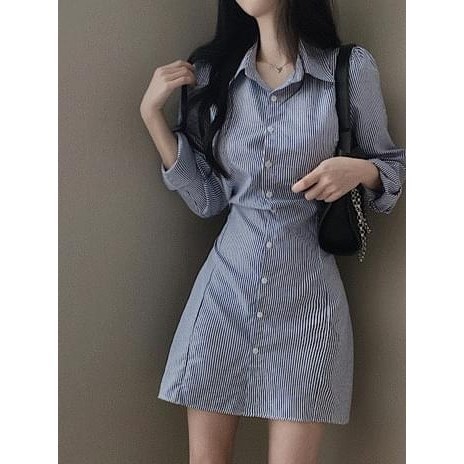 Codibook|韓國 LOVENSOME 條紋襯衫領蓬袖及膝休閒洋裝[預購]迷你短洋裝 襯衫洋裝 女裝天空藍,free|海軍藍,freeCodibook 韓國女裝購物平台