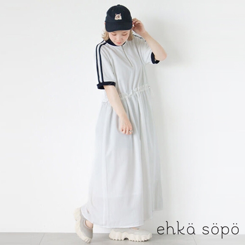 ehka sopo 特色拼接腰際抽繩荷葉邊連身裙(FF46L0H1180)本白F|綠色F|深藍色Fearth music&ecology Select Store