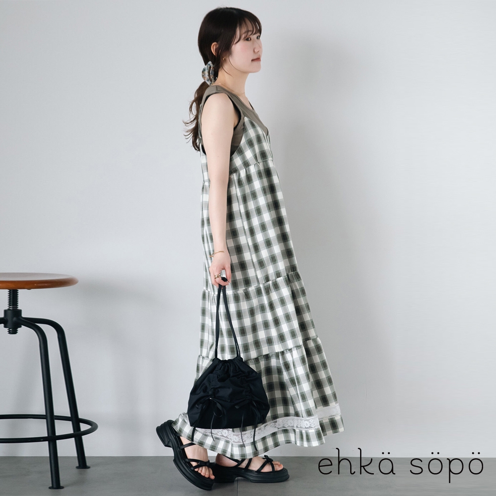 ehka sopo 經典格紋蛋糕分層感下襬蕾絲吊帶洋裝(0F000884810)黃色F|綠色F|淡青色Fearth music&ecology Select Store