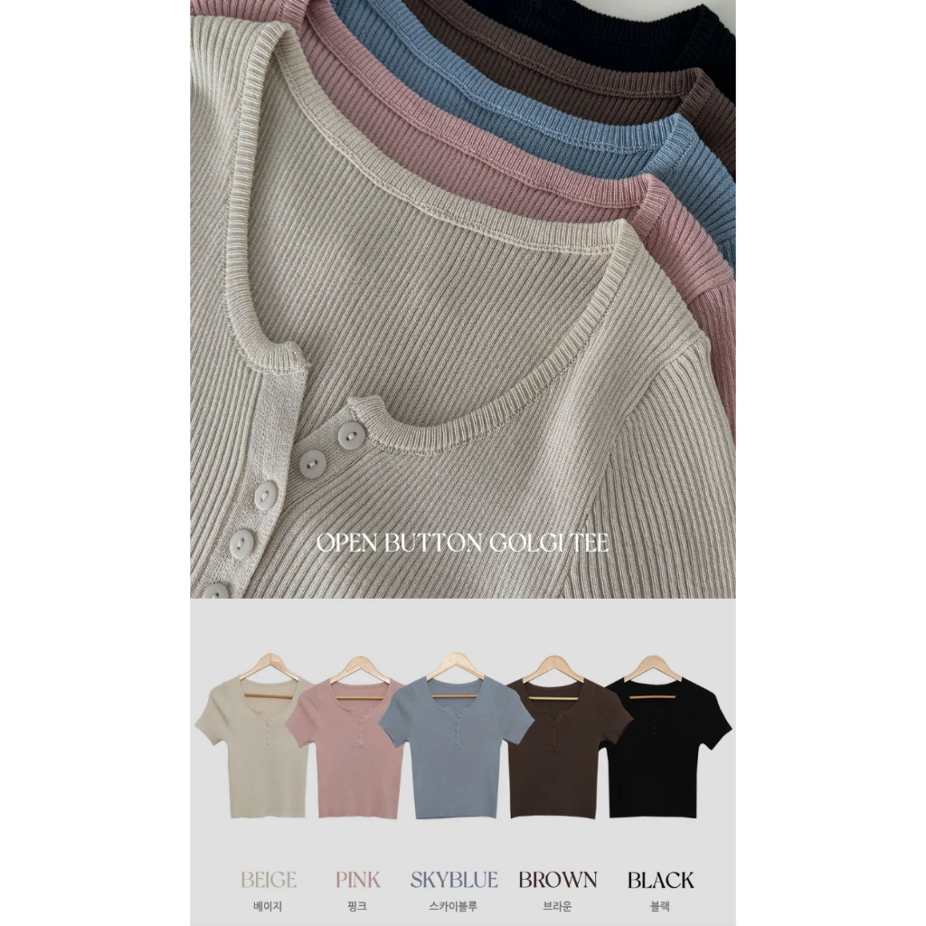 Codibook|韓國 AWAB 開襟排扣U領緊身針織短袖上衣[預購]短袖上衣 T恤 女裝黑色|咖啡色(棕色)|米褐色|天藍色(天空藍)|粉紅色T-shirtsCodibook 韓國女裝購物平台