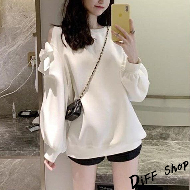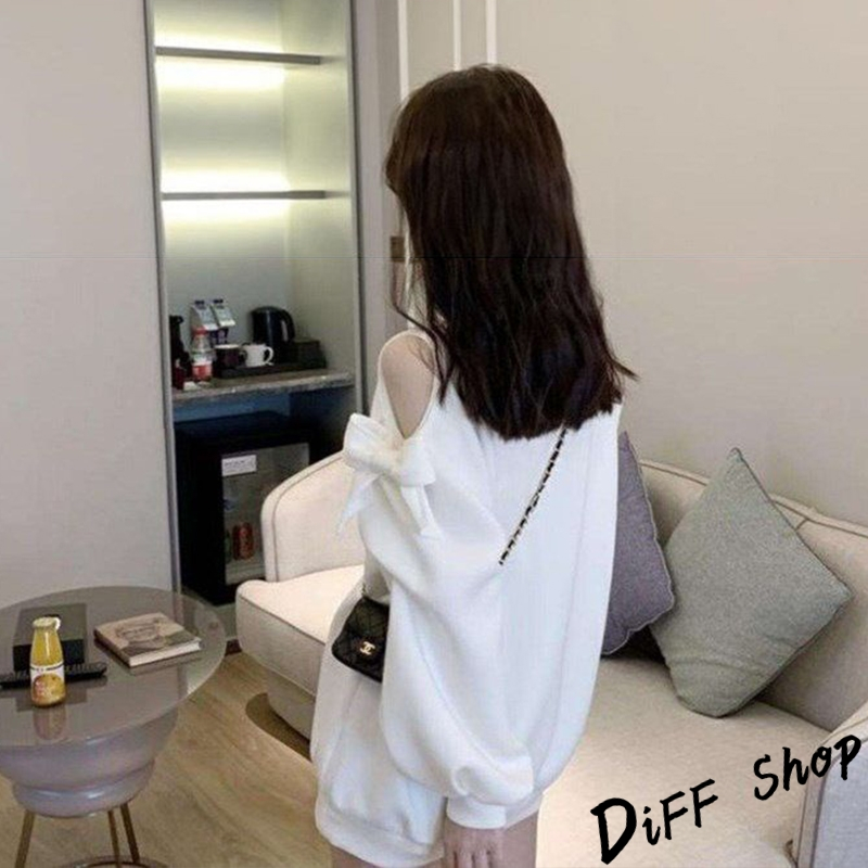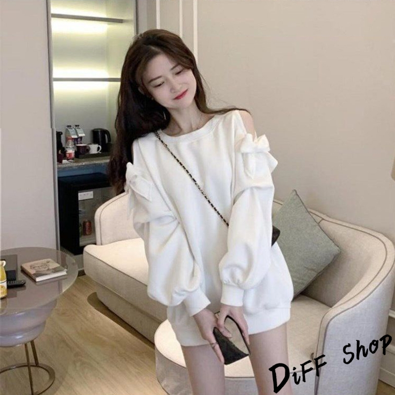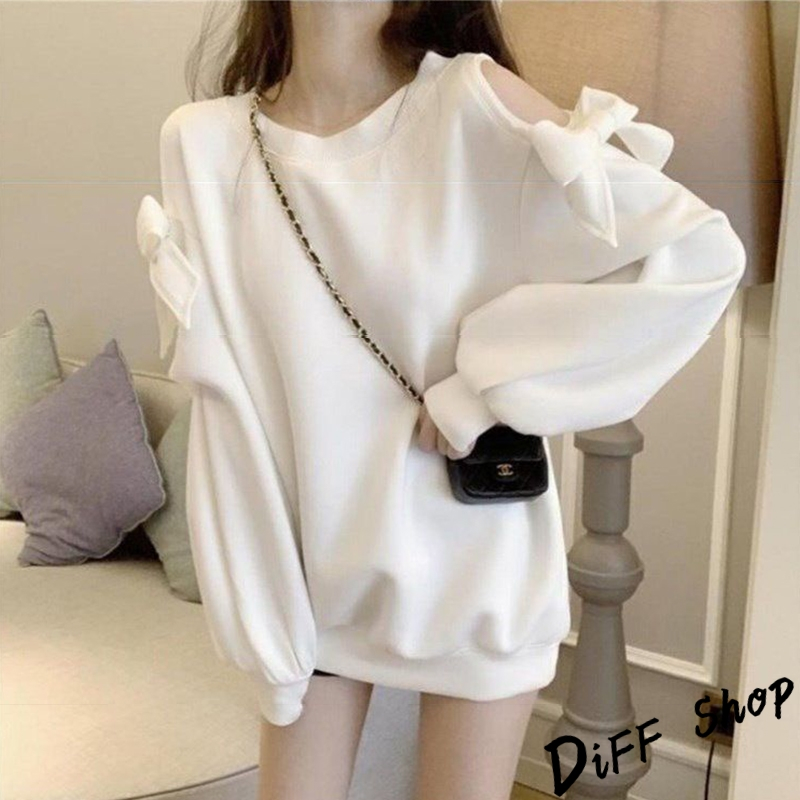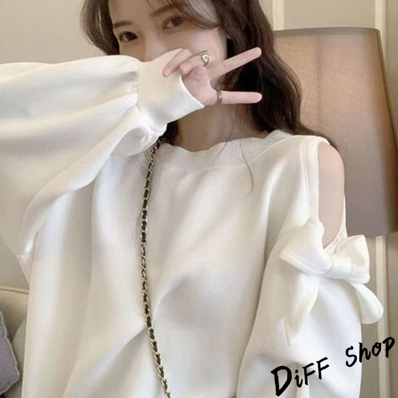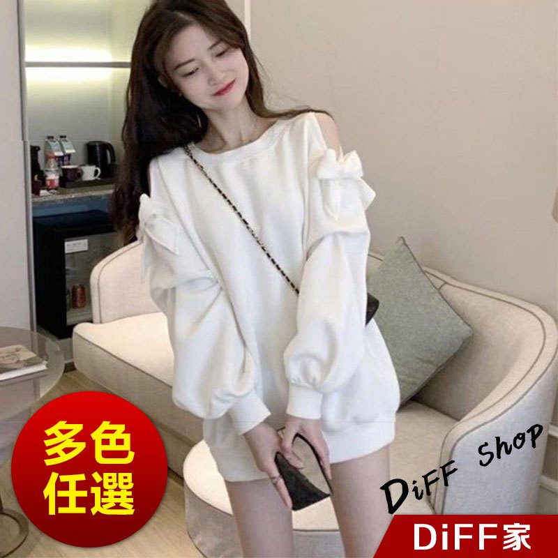 【DIFF】韓版蝴蝶結薄款露肩長袖上衣 女裝 衣服 寬鬆上衣 顯瘦上衣 長袖t恤 冬裝【W472】【W472】白色|【W472】灰色SweatshirtsDiFF shop