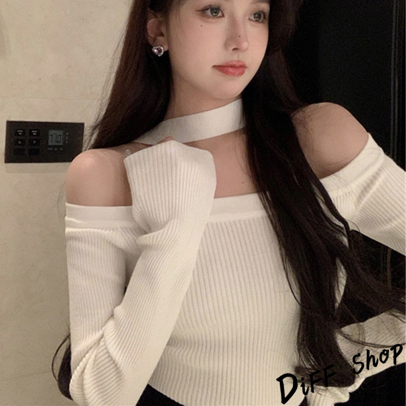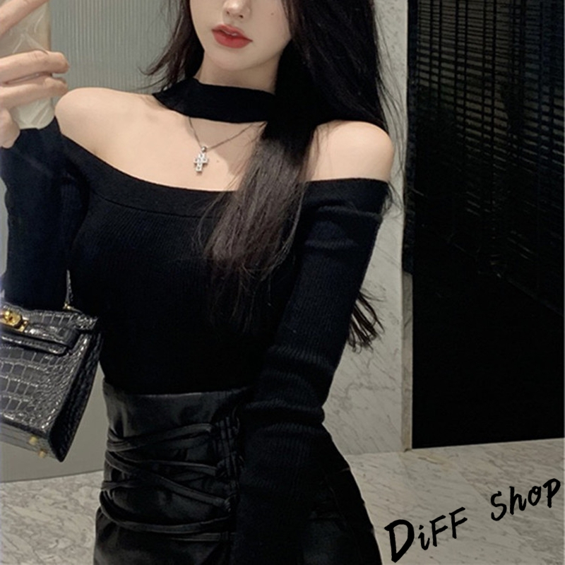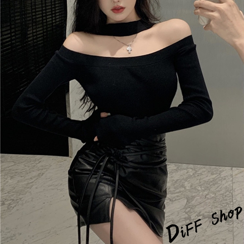 【DIFF】韓版氣質一字肩露肩薄款針織上衣 長袖上衣 女裝 衣服 寬鬆上衣 顯瘦上衣 長袖t恤【W481】【W481】黑色|【W481】白色DiFF shop