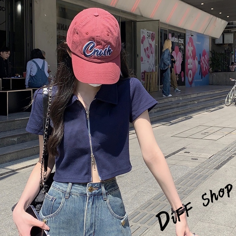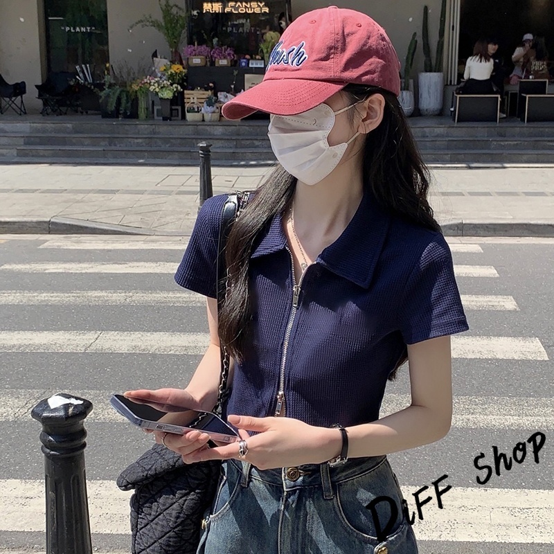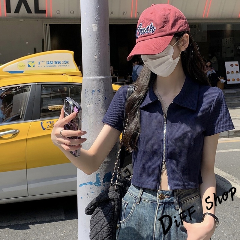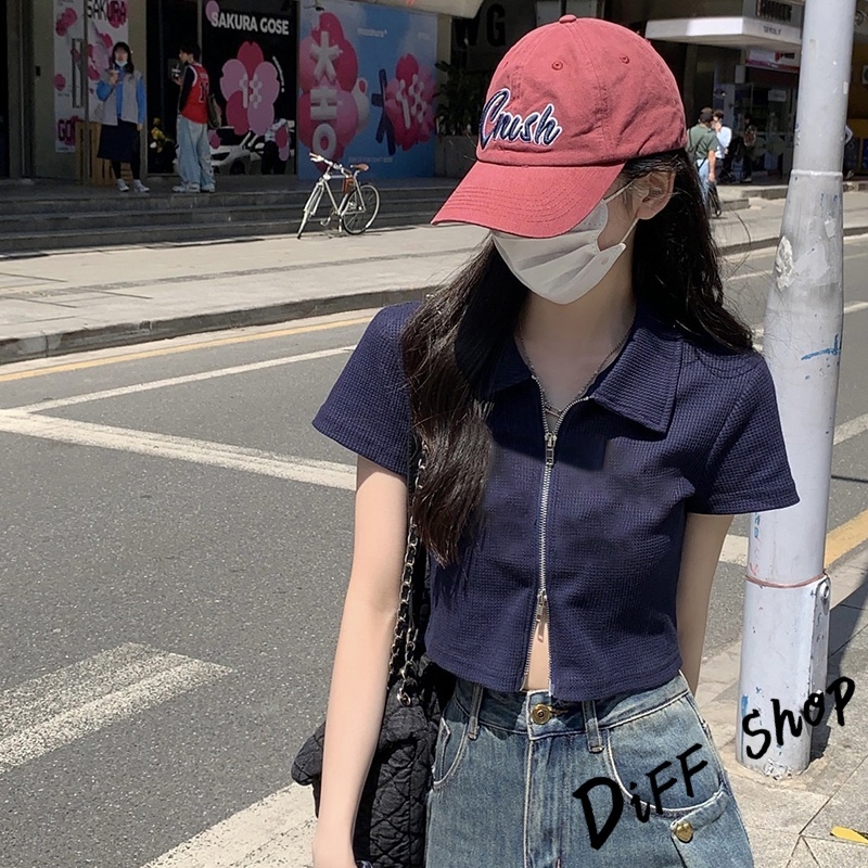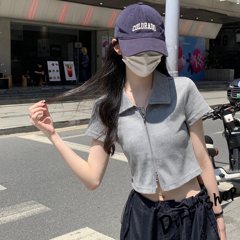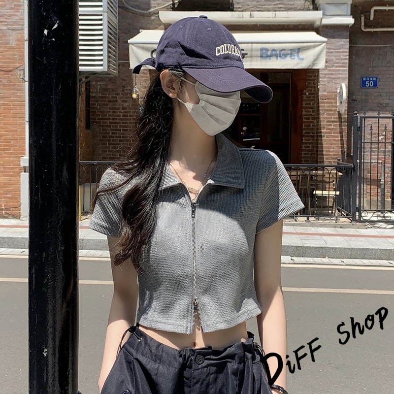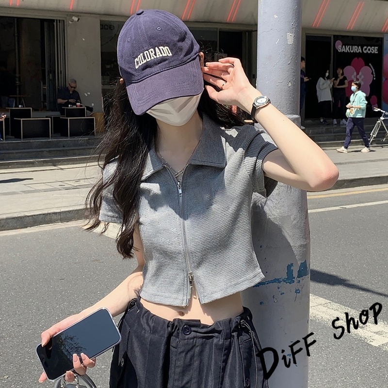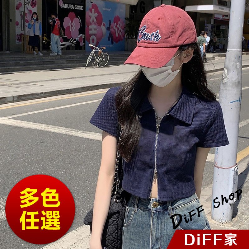 【DIFF】韓版翻領設計感雙拉鍊短版上衣 短袖上衣 衣服 夏天女裝 短板上衣 短版t恤 女裝 短袖t恤女【T526】【T526】灰色|【T526】白色|【T526】黑色T-shirtsDiFF shop