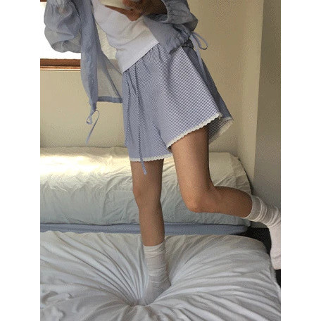 Codibook|韓國 DAILYJOU 條紋蕾絲滾邊短褲[預購]短褲 傘狀裙 女裝天空藍|深藍色(海軍藍)ShortsCodibook 韓國女裝購物平台