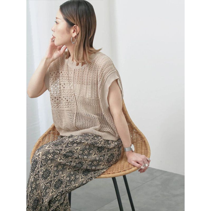 Samansa Mos2 blue 仿亞麻感洞洞拼布剪裁針織背心(0F001067010)黑色F|米色F|淡青色Fearth music&ecology Select Store