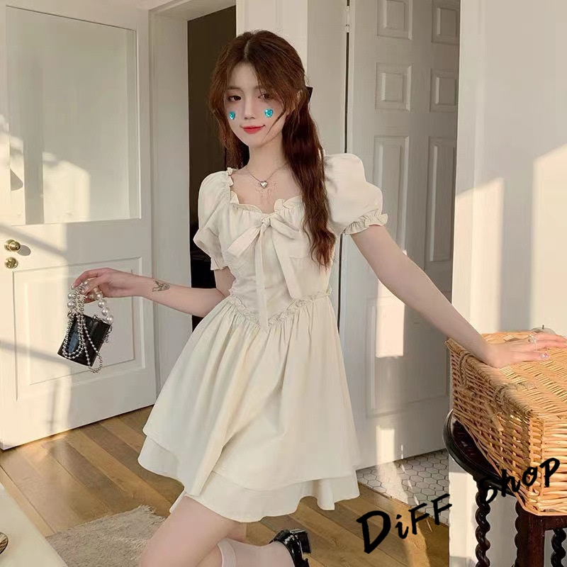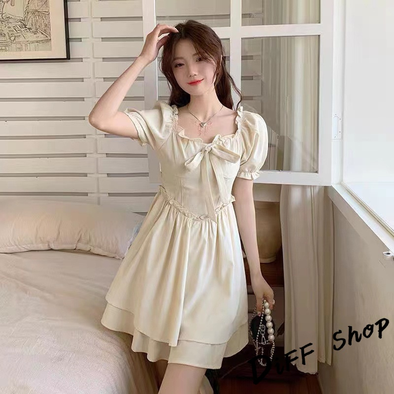 【DIFF】韓版法式方領花邊泡泡袖連衣裙 洋裝 連身裙 上衣 套裝 短袖上衣 短袖t恤 女裝 裙裝 短袖洋裝【S261】【S261】杏色DiFF shop