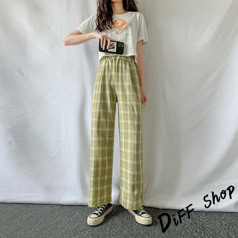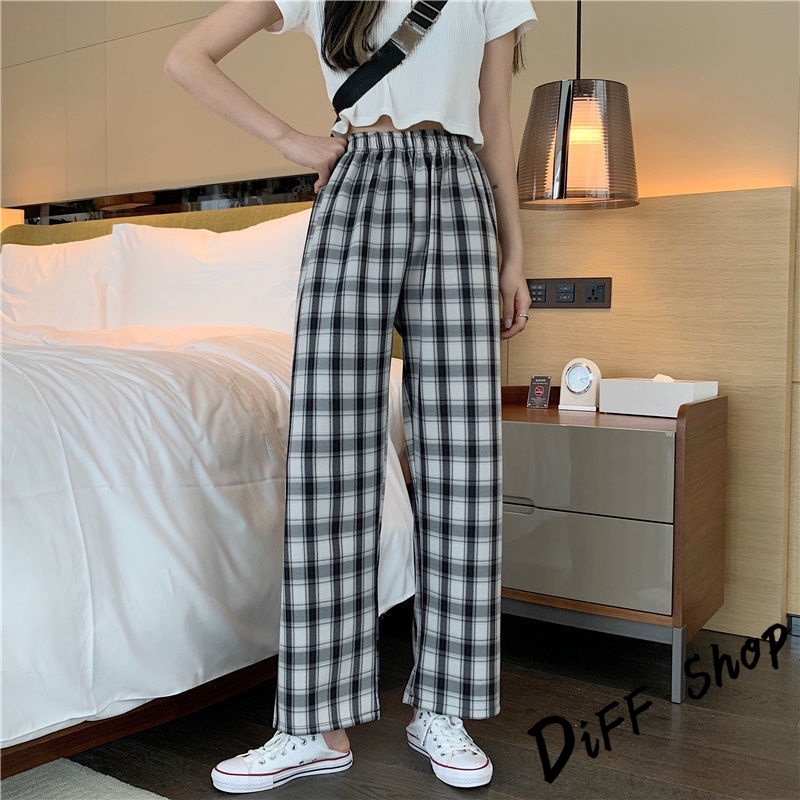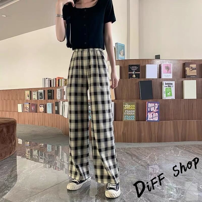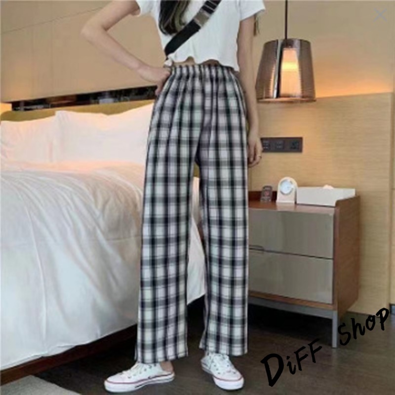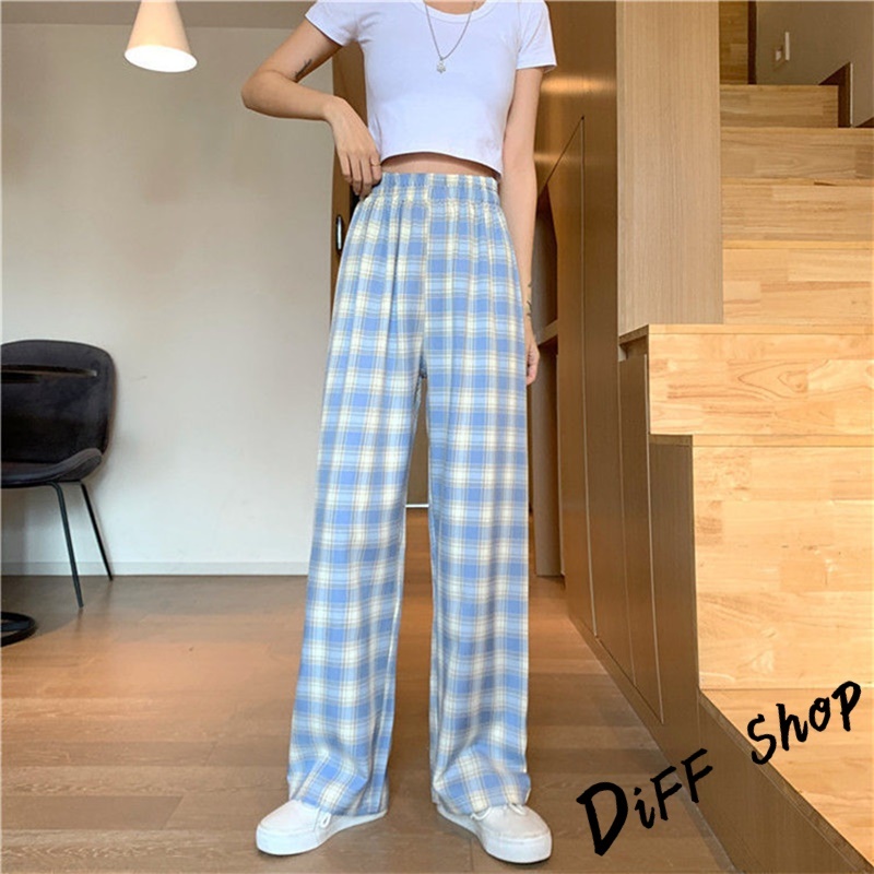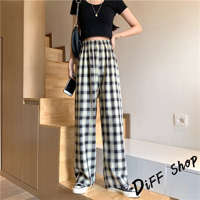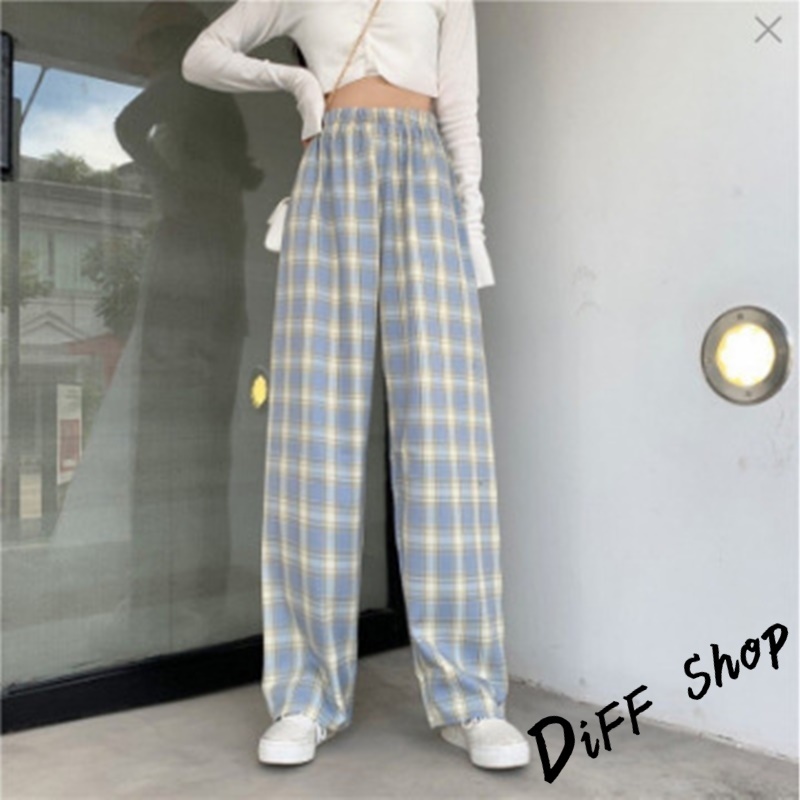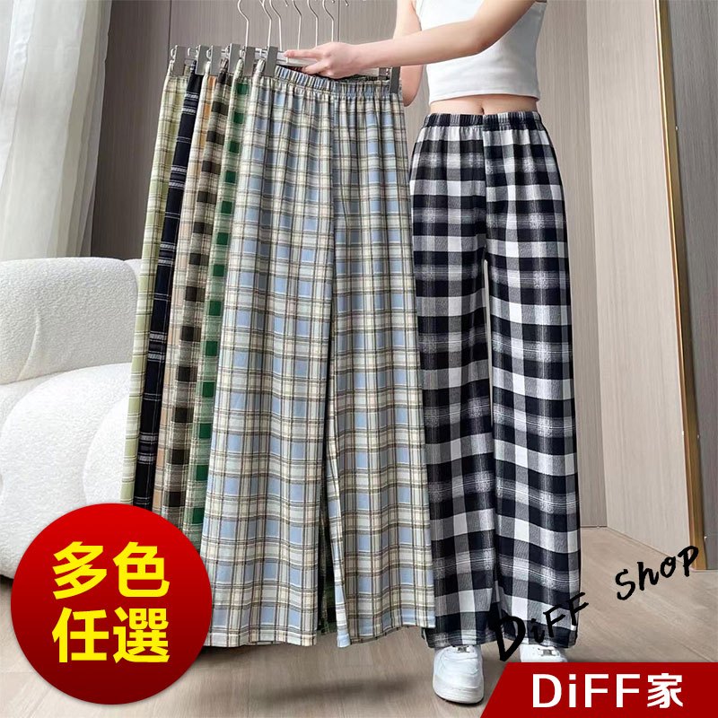 【DIFF】韓版垂感直筒寬鬆顯瘦寬褲 褲子 長褲 休閒褲 女裝 高腰褲 睡褲 直筒褲【P373】【P373】藍格|【P373】棕格|【P373】淺綠格|【P373】黑白格PantsDiFF shop