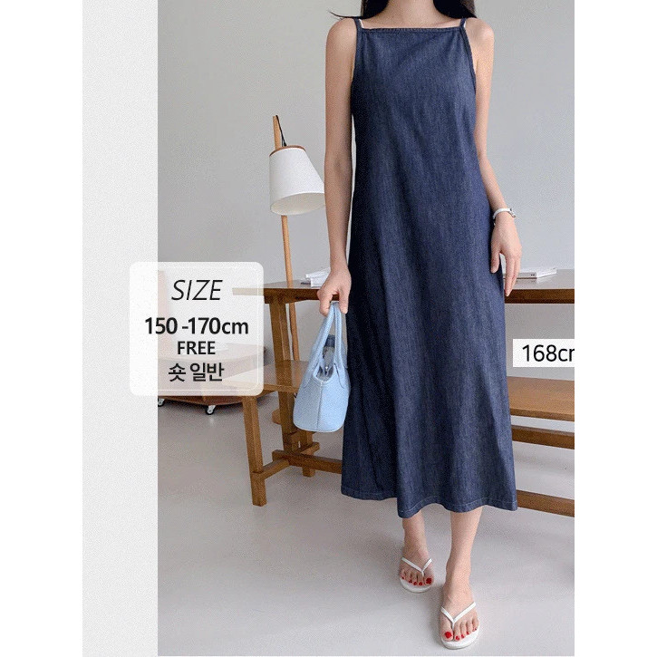 Codibook|韓國 Qnigirls 16支丹寧後鬆緊吊帶方領長版洋裝[預購]及膝洋裝 牛仔洋裝 女裝深藍色-短版|深藍色-一般版-Dani 著用|黑丹寧-短版|黑丹寧-一般版Codibook 韓國女裝購物平台