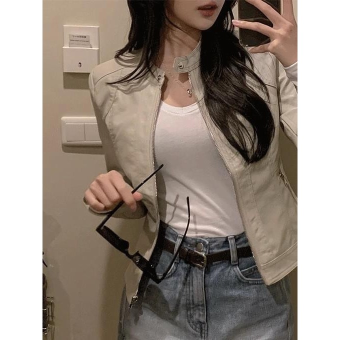 Codibook|韓國 henique 時尚立領拉鏈皮革外套[預購]夾克 皮革外套 女裝黑色,S|米褐色,M|黑色,M|米褐色,L|黑色,L|米褐色,SJacketsCodibook 韓國女裝購物平台