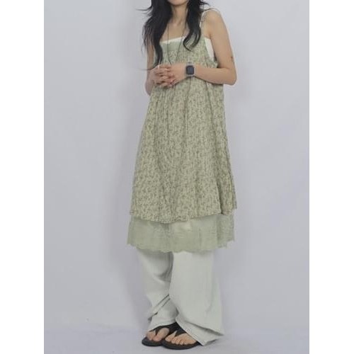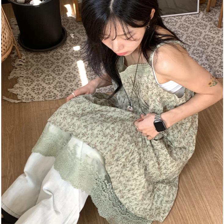 Codibook|韓國 EEZEE 復古森系印花洋裝 DR005[預購]及膝洋裝 細肩帶緞面洋裝 女裝綠色,FreeCodibook 韓國女裝購物平台