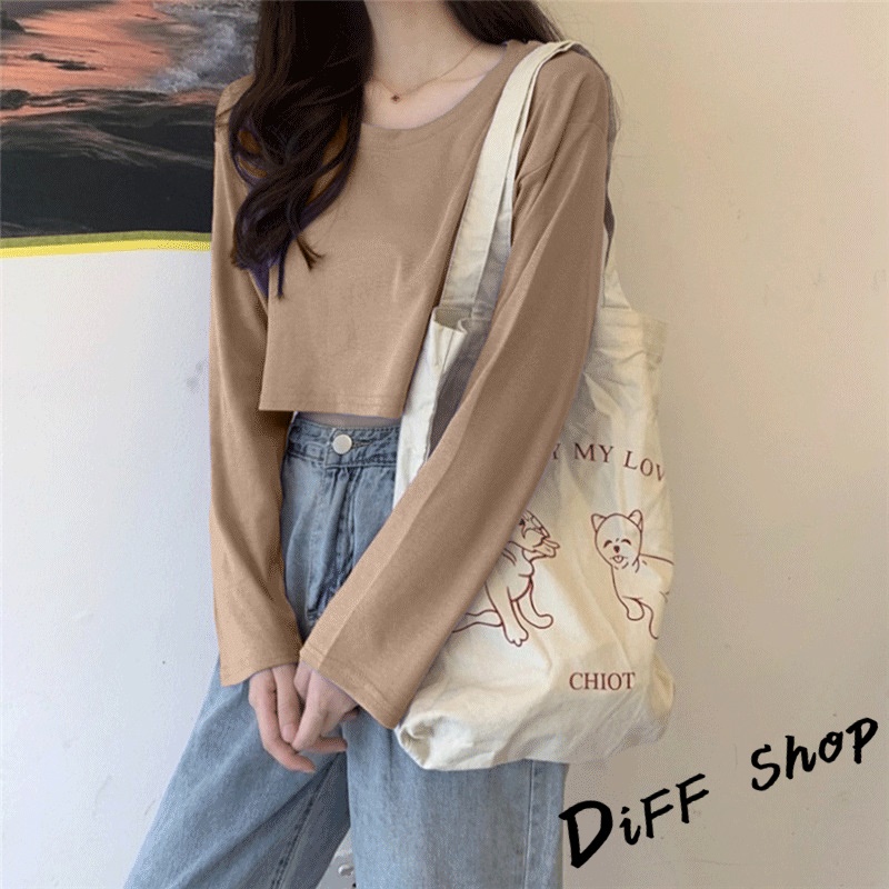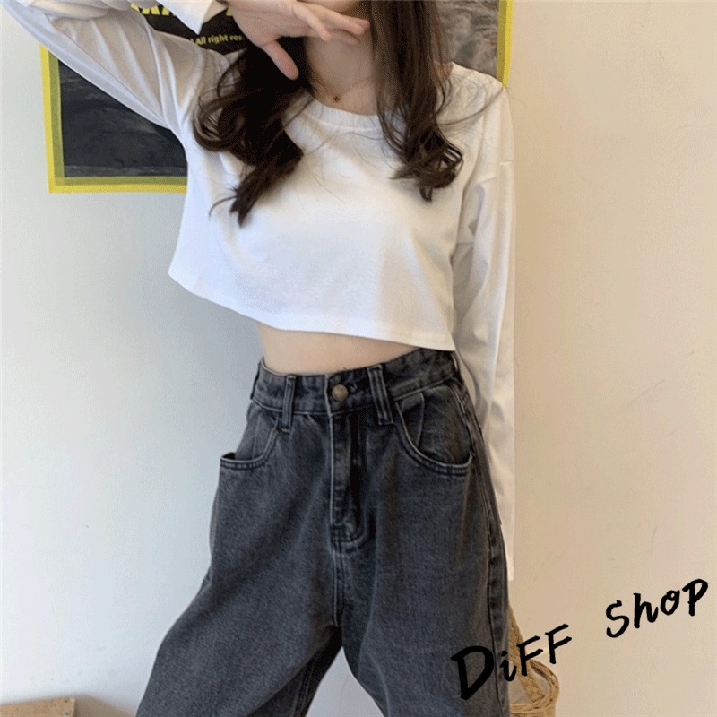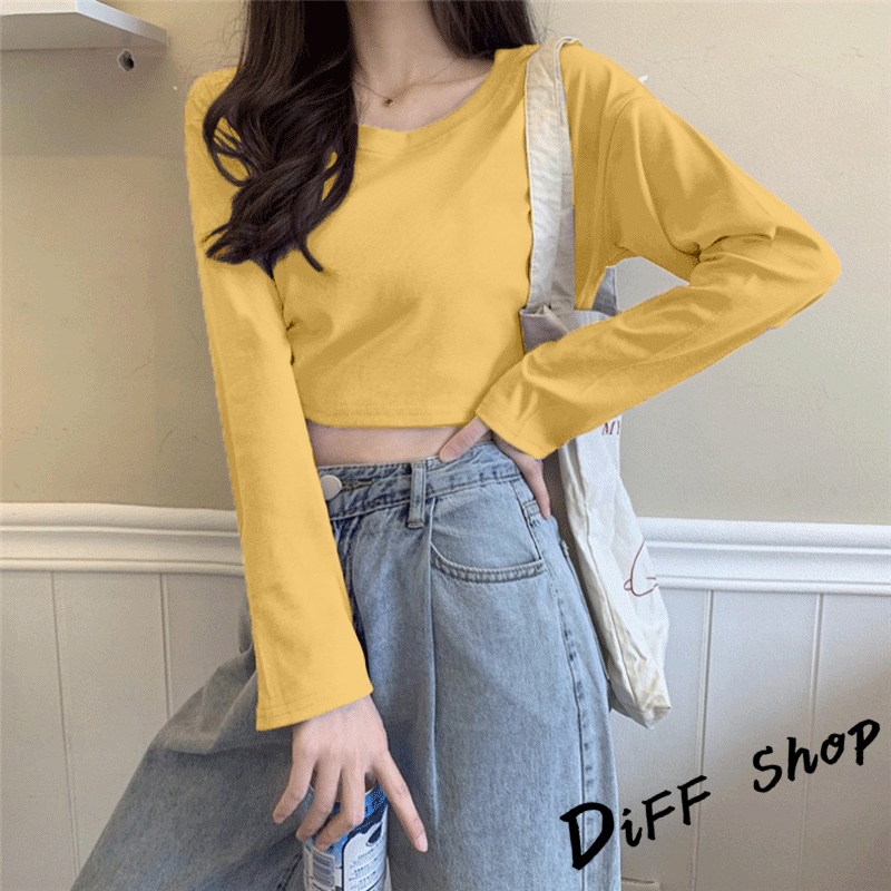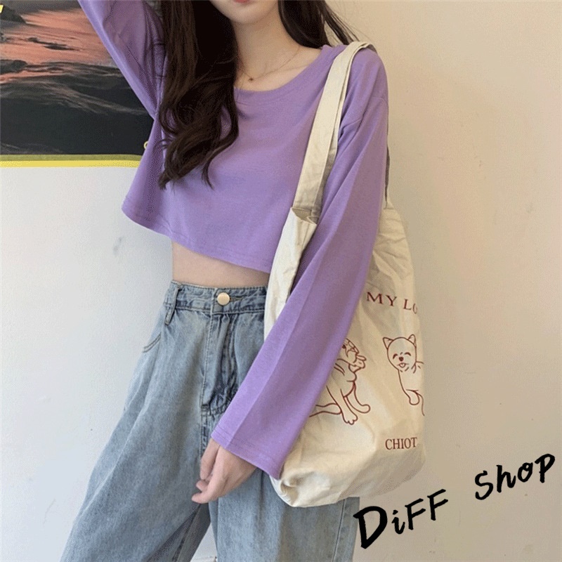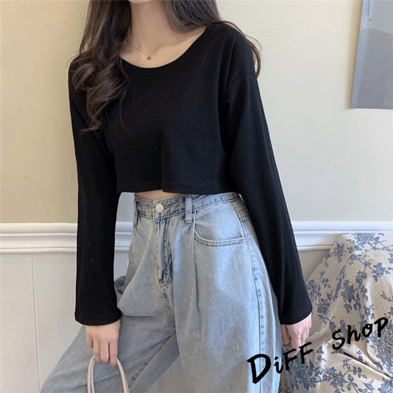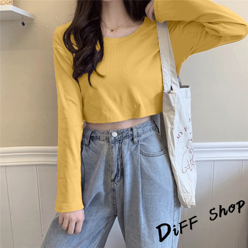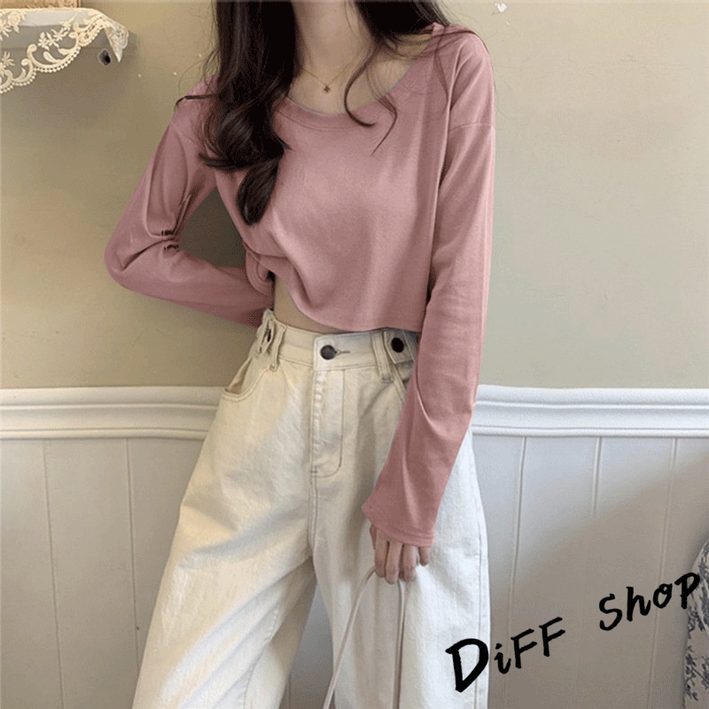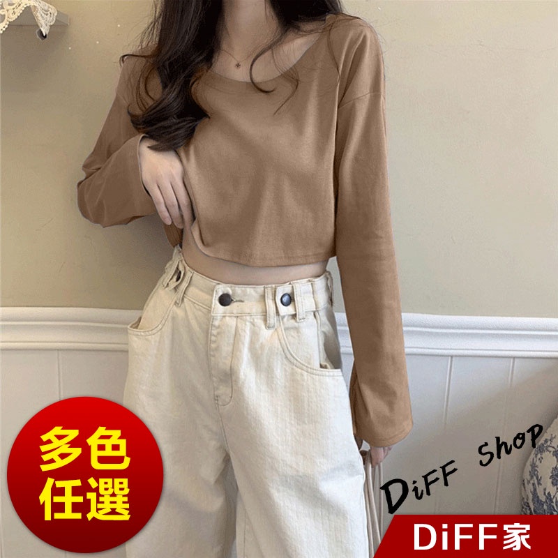 【DIFF】韓版寬鬆素色短版長袖上衣 女裝 衣服 寬鬆上衣 顯瘦上衣 長袖t恤 冬裝 素T【W376】【W376】黑色|【W376】奶油黃|【W376】粉色|【W376】白色|【W376】奶茶|【W376】霧藍|【W376】杏色|【W376】紫色T-shirtsDiFF shop