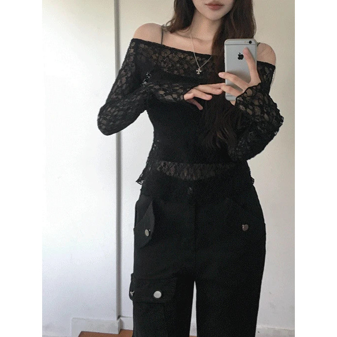 Codibook|韓國 henique 透膚蕾絲露肩長袖上衣[預購]長袖上衣 雪紡襯衫 女裝白色|黑色T-shirtsCodibook 韓國女裝購物平台