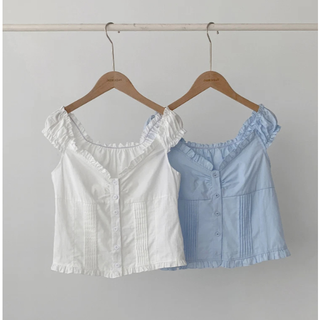 Codibook|韓國 JASMINBELL 檸檬風格荷葉邊縮褶蕾絲露肩無袖上衣[預購]雪紡襯衫 女裝象牙白,無|天空藍,無Shirts & BlousesCodibook 韓國女裝購物平台