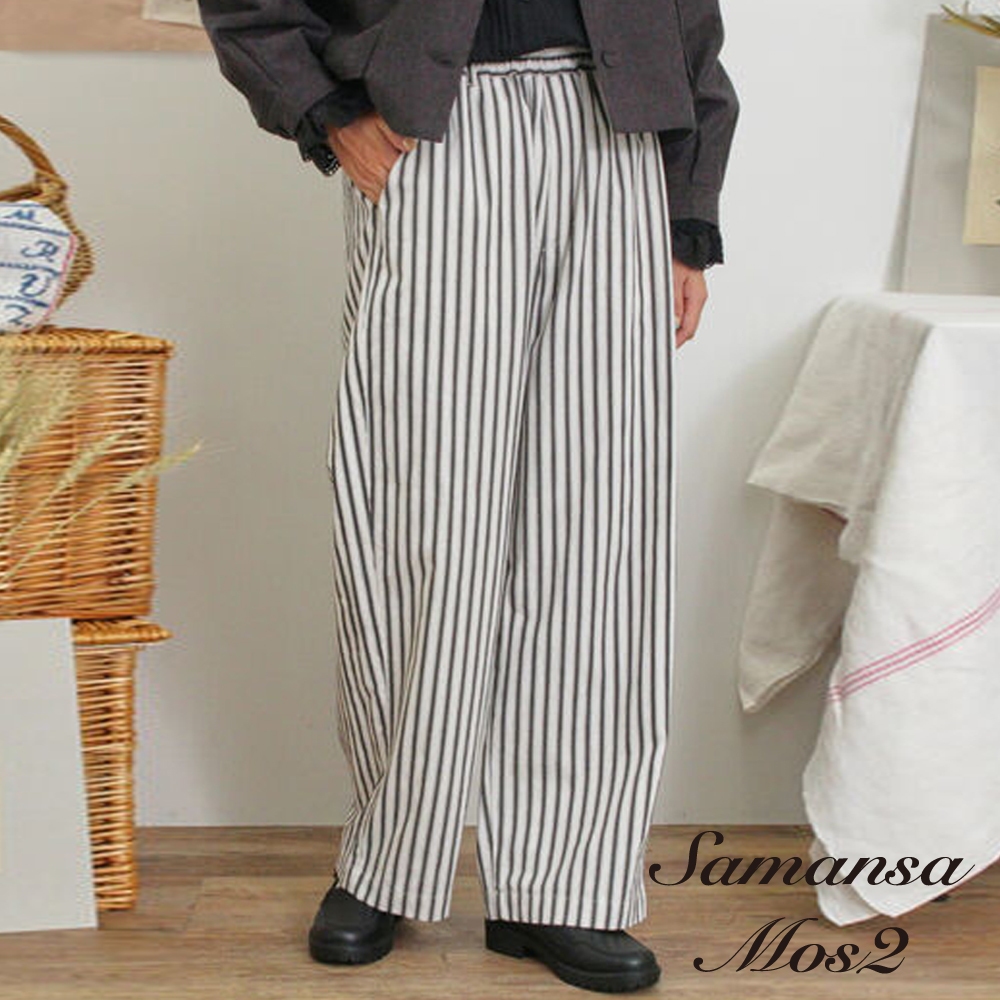 Samansa Mos2 素面/直條紋純棉寬褲(FL43L0F0880)象牙色F|黑色F|深咖啡色FPantsearth music&ecology Select Store