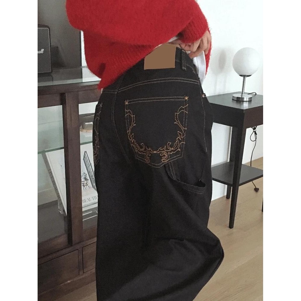 Codibook|韓國 wonderwonder 刺繡鬆身工裝丹寧長褲[預購]牛仔褲 女裝黑,S|黑,M|黑,LCodibook 韓國女裝購物平台