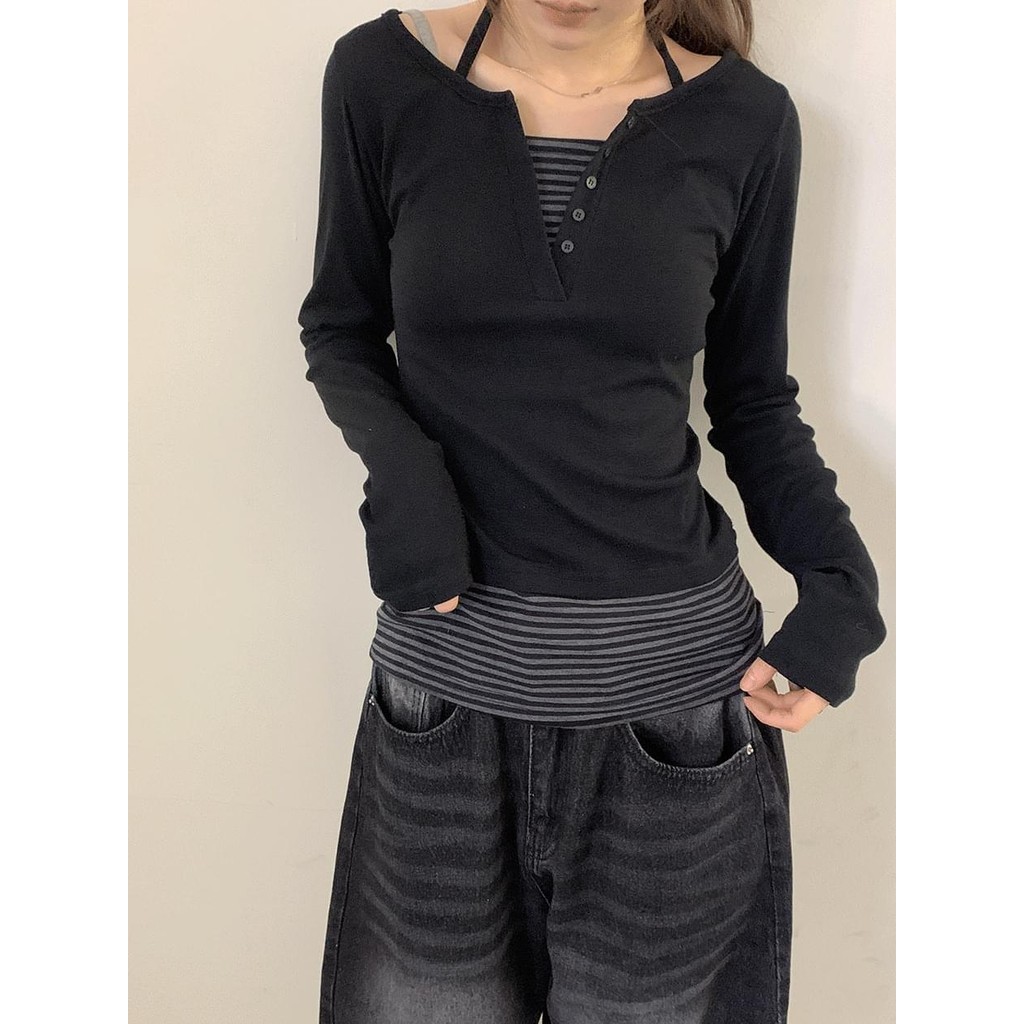 Codibook|韓國 ondeed 黑白條紋翻領分層長袖T恤[預購]長袖上衣 T恤 女裝黑,FREE|深灰色,FREET-shirtsCodibook 韓國女裝購物平台